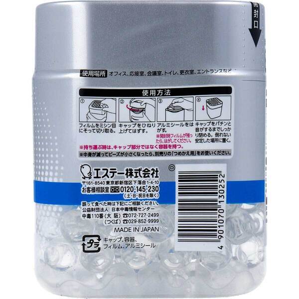 ハイブリッド消臭テクノロジーを採用。 幅広いニオイを強力に消臭する「ハイブリッド消臭テクノロジー」を 採用した業務用消臭剤です。 ※汗臭、体臭、尿臭に効果のある消臭成分を組み合わせた処方です。 ・薬液をたっぷり吸い込んだビーズが、悪臭をぐんぐん吸い込みます。 ・さわやかなソープの香りです。 個装サイズ:93X113X93mm 個装重量:約470g 内容量:400g 製造国:日本 【発売元:エステー株式会社】 【品名】 消臭・芳香剤 【用途】 室内・トイレ用 【成分】 香料、エタノール、界面活性剤(非イオン、両性)、脂肪酸塩系消臭剤、吸水性樹脂 【使用期間】 通常約2~3ヵ月間持続します。 【使用方法】 (1)フィルムをミシン目にそって切り取る。 (2)キャップをひねり上げてはずす。 (3)アルミシールをはがす。 ※開封時フィルムが残ったら、はがしてください。 (4)キャップをパチンと音がするまでしっかり閉める。 倒れない安定した場所に置く。 ※持ち運ぶ時は、キャップ部分ではなく容器を持つ。 ※中身が減ってビーズが小さくなったら、別売りの「つめかえ用」をお使いください。 【注意】 ・本品は食べられない。 ・乳幼児の手の届かないところに保管する。 ・お年寄り、小児、認知症の方などが誤って食べると、気管に入るなど重症になる恐れがあるので、ご家族の方は製品を手の届かないところに置くなど、特に気をつける。 ・薬剤がこぼれた場合はすぐに拭き取る。 ・落下・転倒・破損させない。 ・高温になる所や直射日光の当たる所には置かない。 ・つまりの原因となるので排水口には流さない。 ・用途以外に使用しない。 【応急処置】 ・万一、間違って食べた場合は医師に相談する。 ・液が目に入った場合は充分流水で洗う。 皮フについた場合は石けんで洗う。 異常のある時は医師に相談する。 注意事項 予告なく成分・パッケージが変更になることがございます。 予めご了承ください。 *予告なく成分・パッケージが変更になることがございます。予めご了承ください *ダンボールを使用して発送する場合には、入数以下の個数の場合、 中古ダンボールを使用する場合があり、ご注文の商品とは異なるダンボールになる場合があります。 あらかじめ、ご了承ください。 |