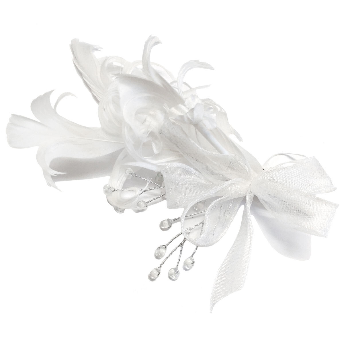 | ホワイト 羽根&オーガンジーリボン&クリスタルビーズ(シルバーワイヤー)&小花 | |