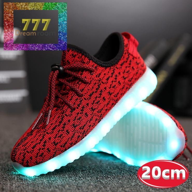 kids 7色に光る☆LED ライトアップ MIXツイードスニーカー 靴紐type 【レッド 20cm】 韓国子供服 キッズ シューズ 子供用 男女
