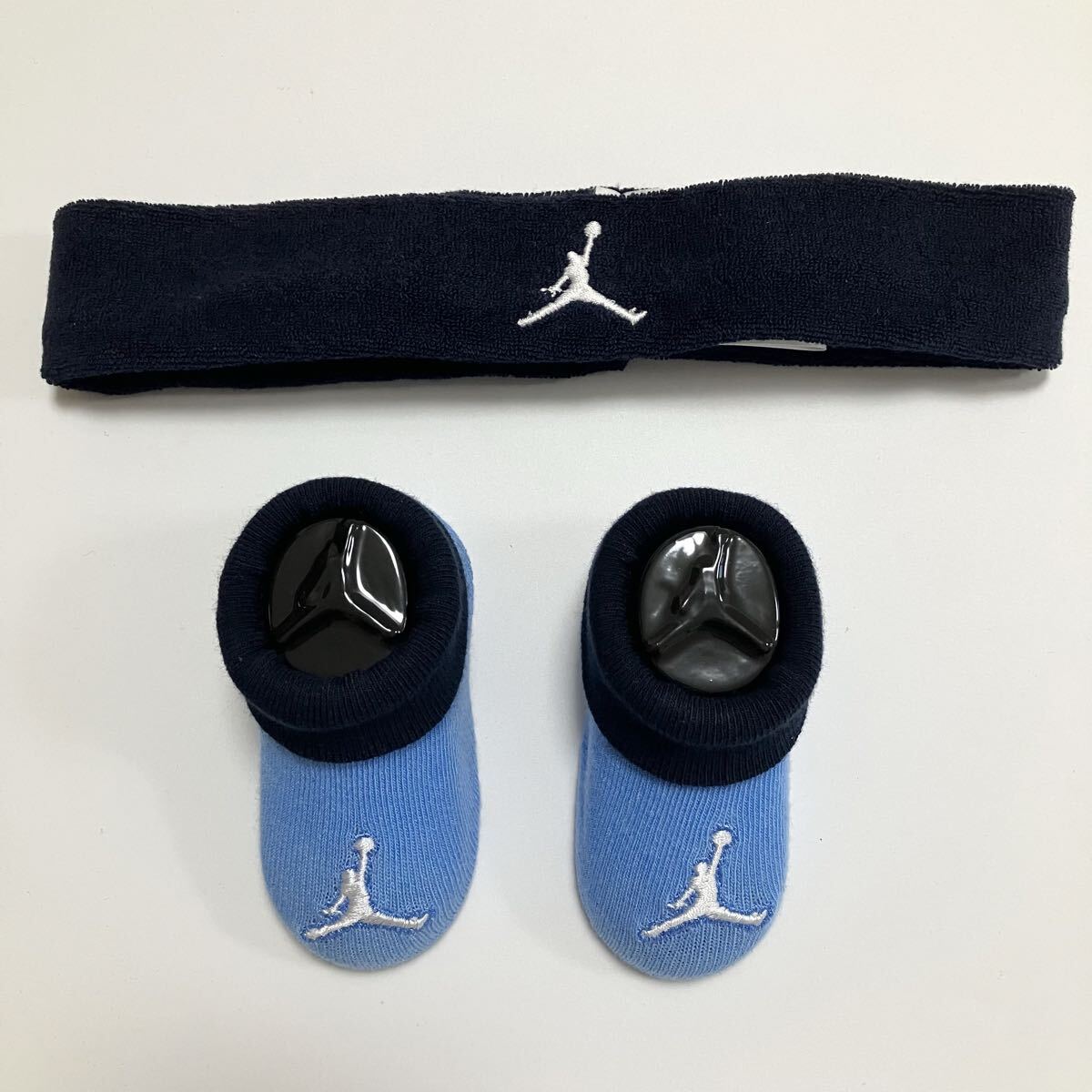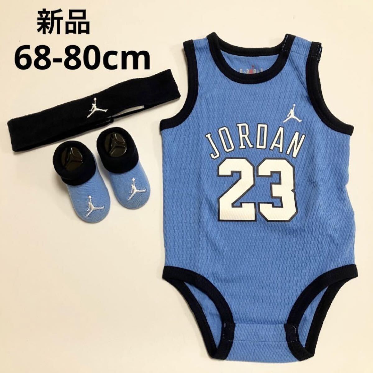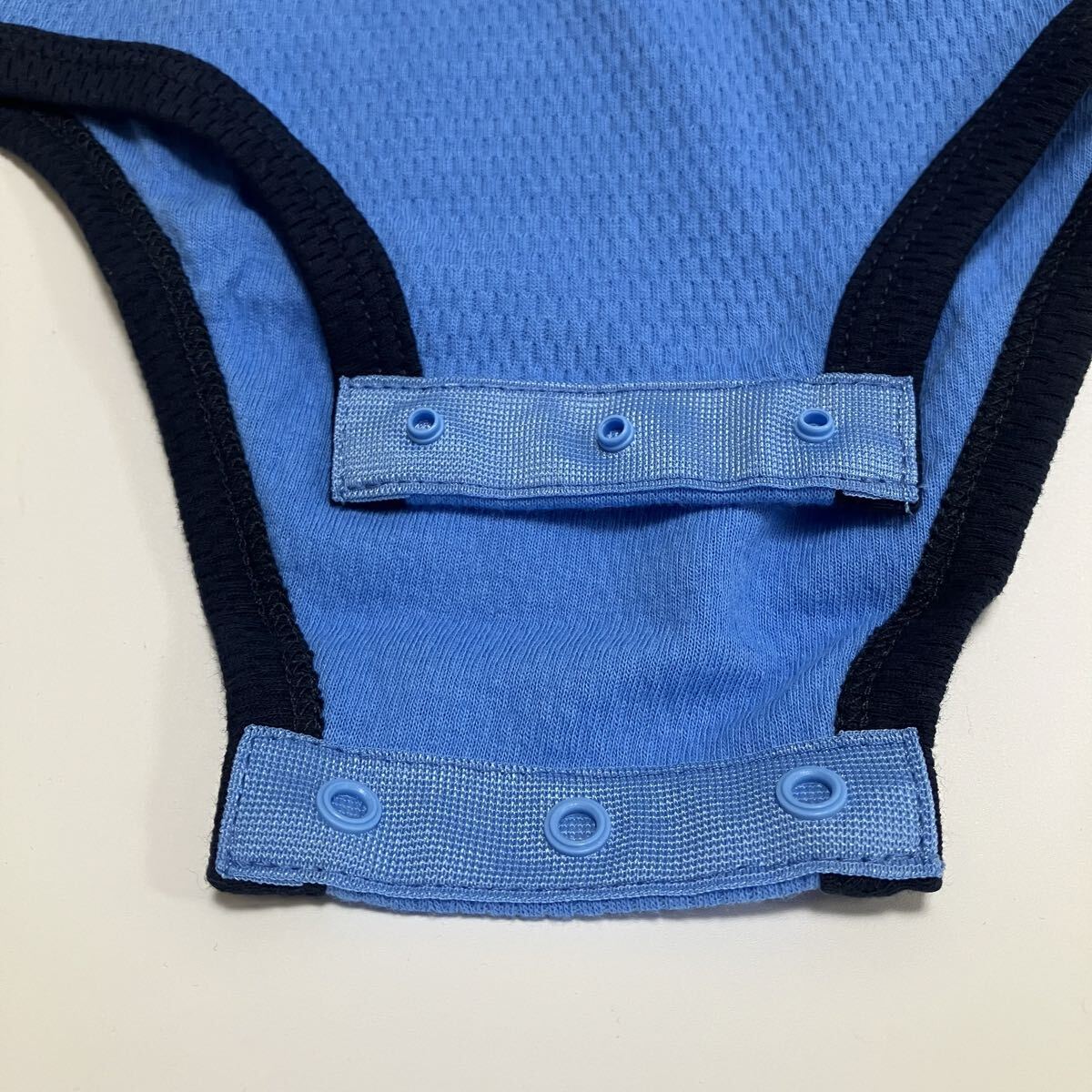 ブランドロゴがアクセントのロンパースとヘアバンド、靴下の3点セット。着せ替えやおむつ替えをラクにしてくれる肩、股下スナップボタン付きです。