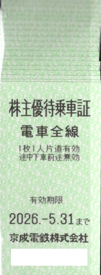 京成電鉄株主優待乗車証20枚売り。期限2026年5月31日。