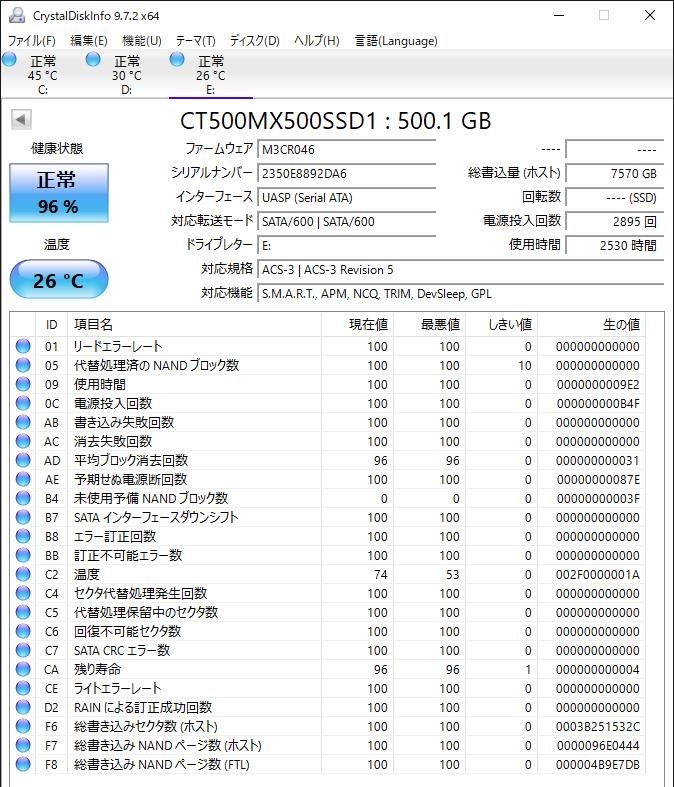 SSD 500GB 2.5インチ / Crystal DiskInfo 正常 / #170 / crucial crucial MX500 / CT500MX500SSD1