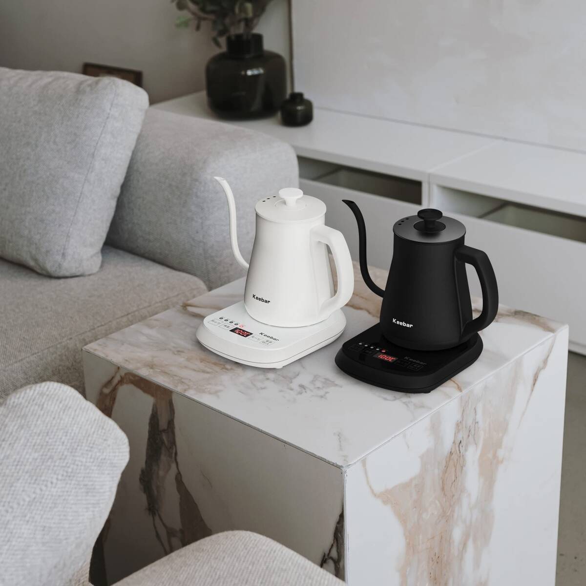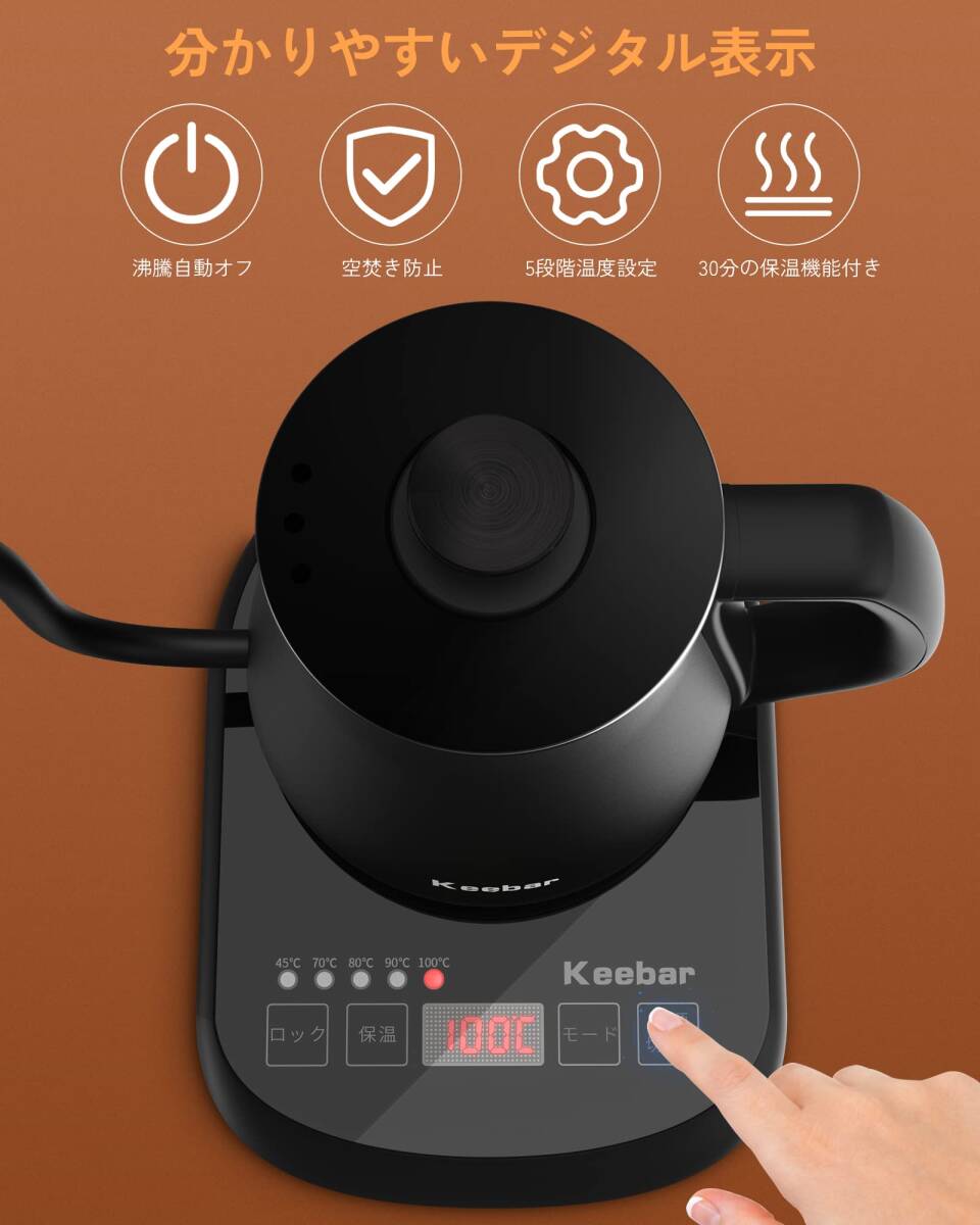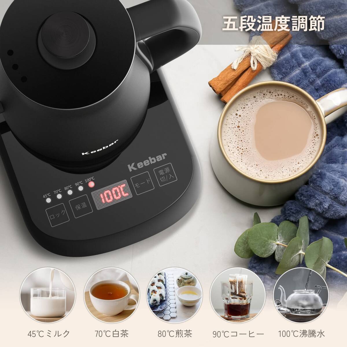 ☆この電気ケトルは5段階の温度設定(45℃/70℃/80℃/90℃/100℃)を搭載しており、コーヒーやお茶などの飲料を理想的な温度で淹れることができます。さらに、沸かしたお湯を30分間保温する機能もついており、繰り返し湯を沸かす手間を省けます。