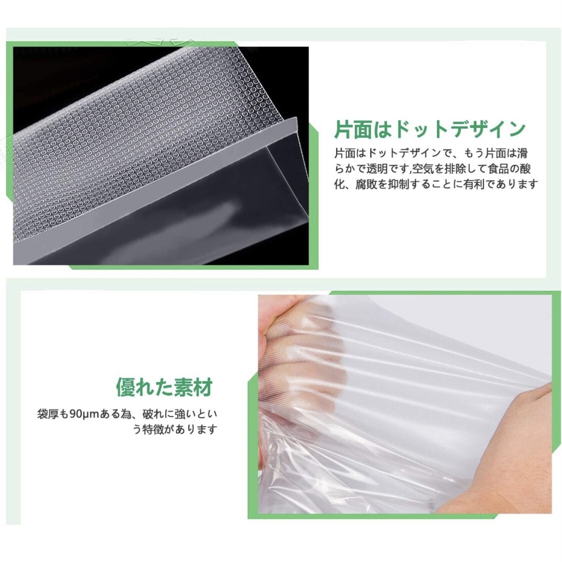 【デザイン】片面はドットデザインで、内側にはエンボス加工され、もう片面は滑らかで透明です。エンボス加工という、フィルムの表面を凸凹させる技術が施されています。真空パック器で上下から圧をかけ、密着させた際に凸凹の隙間から空気を吸い取リます。8層構造のフィルムで、密閉性が高いです。袋厚も90μmある為、破れに強いという特徴があります。通常保存よりも雑菌の増殖を約1/50に抑えるから、食品の鮮度が長持ち可能です。