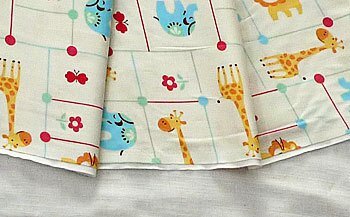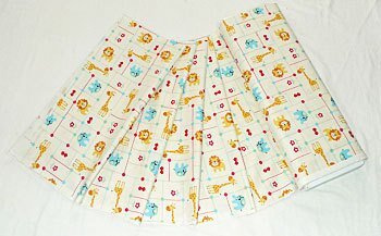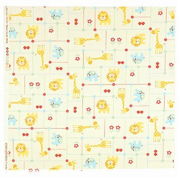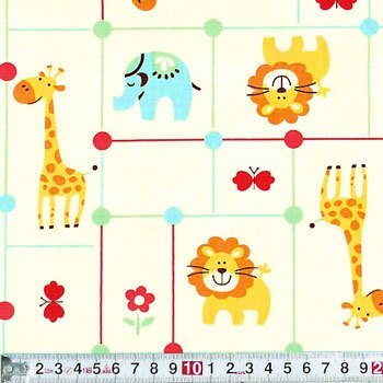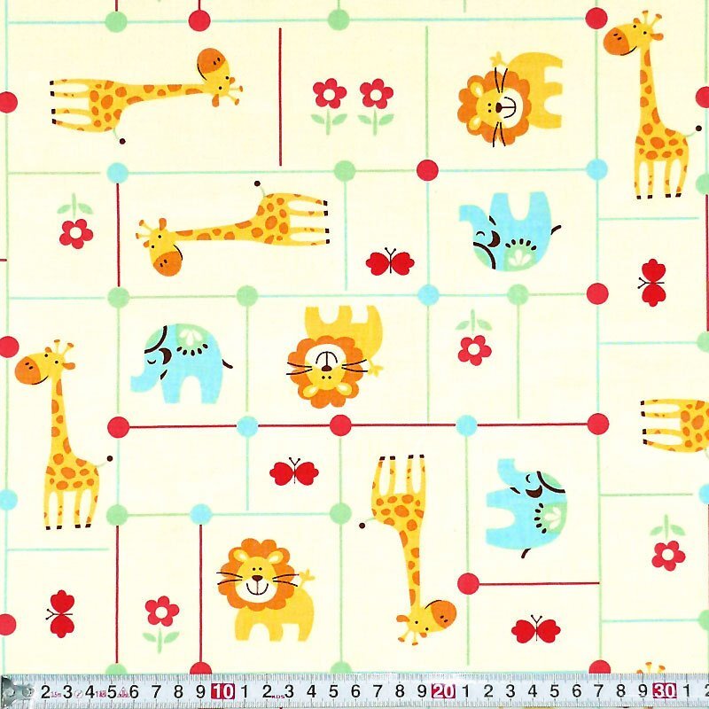 キリン、ゾウ、ライオン、蝶々、お花をモチーフに優しい色合いでコミカルに描いたサンプラー柄。