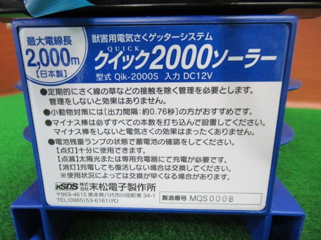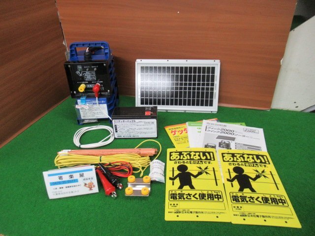 電気柵 【メーカー】 末松電子 【型式】 クイック2000ソーラーセット 【仕様】 ・電源(V)DC12 ・消費電力(W)0.416(最大:0.57)、(エコ回路作動時:0.035/最大0.049) ・出力電圧(V)約9500 ・電線長さ(m)最大:2000 ・重量:5.0kg [ソーラーパネル寸法(縦×横×奥行)(mm)] ・ソーラーパネル正面・背面取付:435×330×220 ・ソーラーパネル側面取付:435×165×330 [機能] ・出力間隔:約1.1秒/イノシシ・シカ等、 ・出力間隔:約0.76秒/サル・小動物等、連続24時間作動、 ・夜出力:夜のみ作動(光センサーで明るさを感知) [対象動物] ・イノシシ・シカ・サル・小動物 等 【付属品】 ミニゲッターパックS 出力コード2.5m バッテリーコード マイナス棒30型(アース棒30型) 注意表示板(2枚) 取扱説明書 未使用品になります。 ※初期不良の場合商品到着後7日間は返品対応致します。 ※実作業による長時間の確認は行っておりません。 未使用品になりますが撮影及び中身確認の為開封させていただいておりますのでご了承ください。 画像の物が全てになります。 他に付属品等はございません。 上記の事をご理解・ご了承の上で ご入札をお願い致します。 その他ご不明な点等ございましたら、ご入札前にお気軽にご質問下さい。 ※17時以降にお問い合わせ頂いたご質問等につきましては、お応えするのが翌営業時間中になりますのでご了承ください。 ※オークション終了日当日のご質問は、17時迄にお願い致します。 *詳細につきまして ご質問されましても お答えできない場合もございます。 | ||||