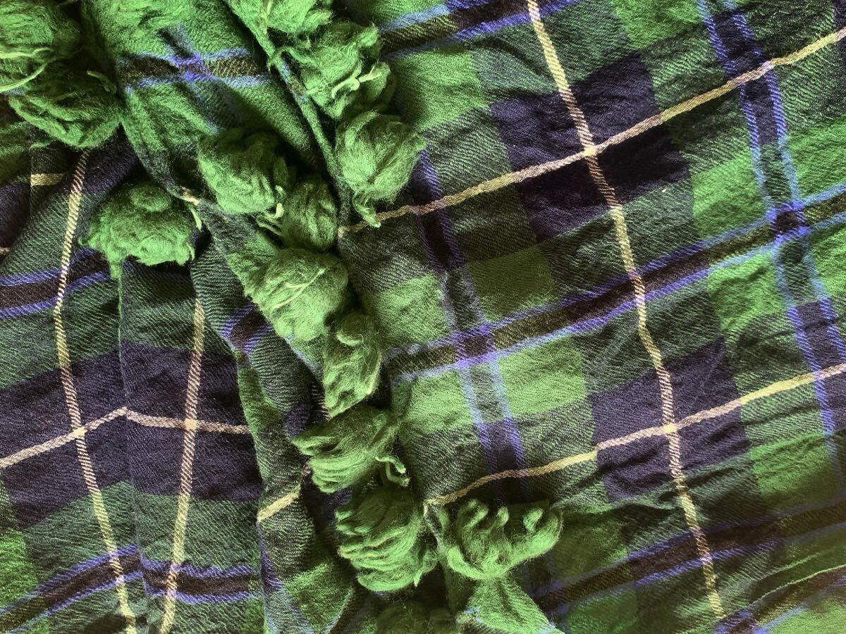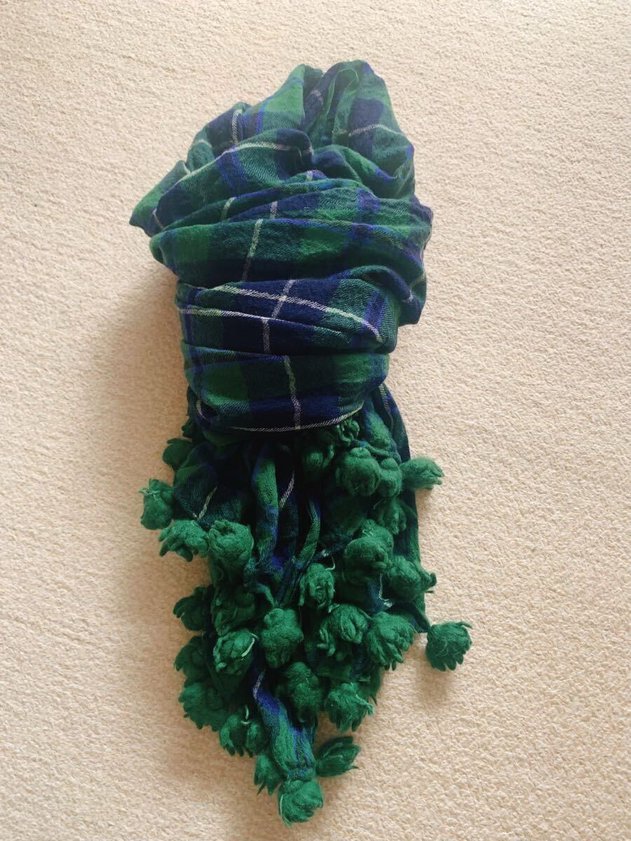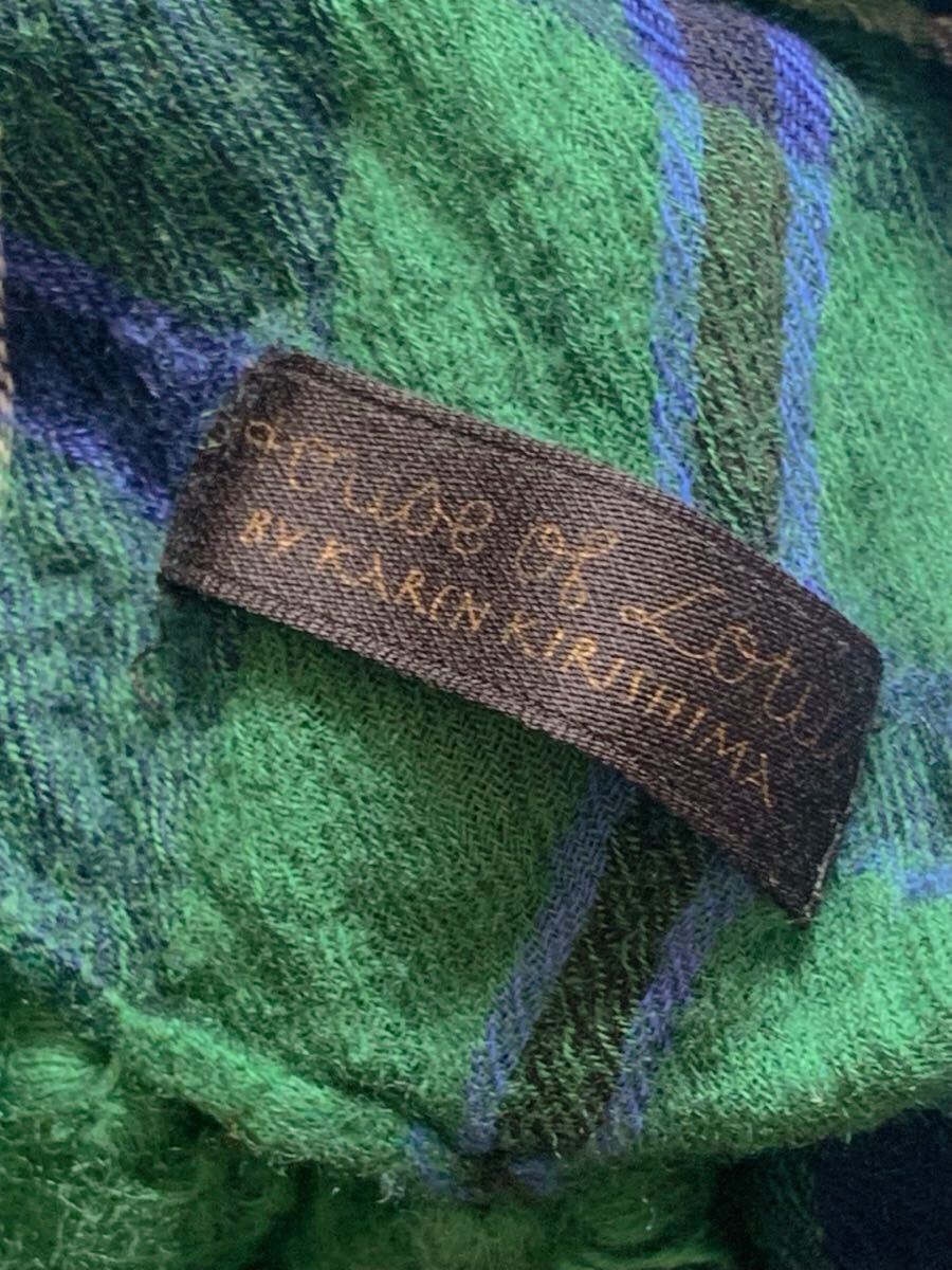 ハウスオブロータス チェックの大判ストールです。先端に小さなボンボン的な飾りがついています。強い風が吹いても、重しの役目にもなり便利です。緑のチェック色が落ち着いているので、オフィスでも着用可能です。全体的に綺麗ですが、used品なのでご了承頂ける方のみ、落札をお願い致します。サイズは(約)横76センチ、縦186センチです。大判なので、身体全体を羽織る事が出来ます。