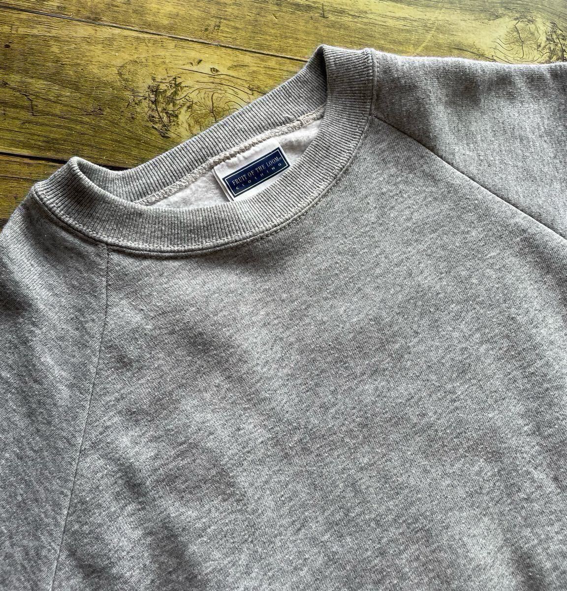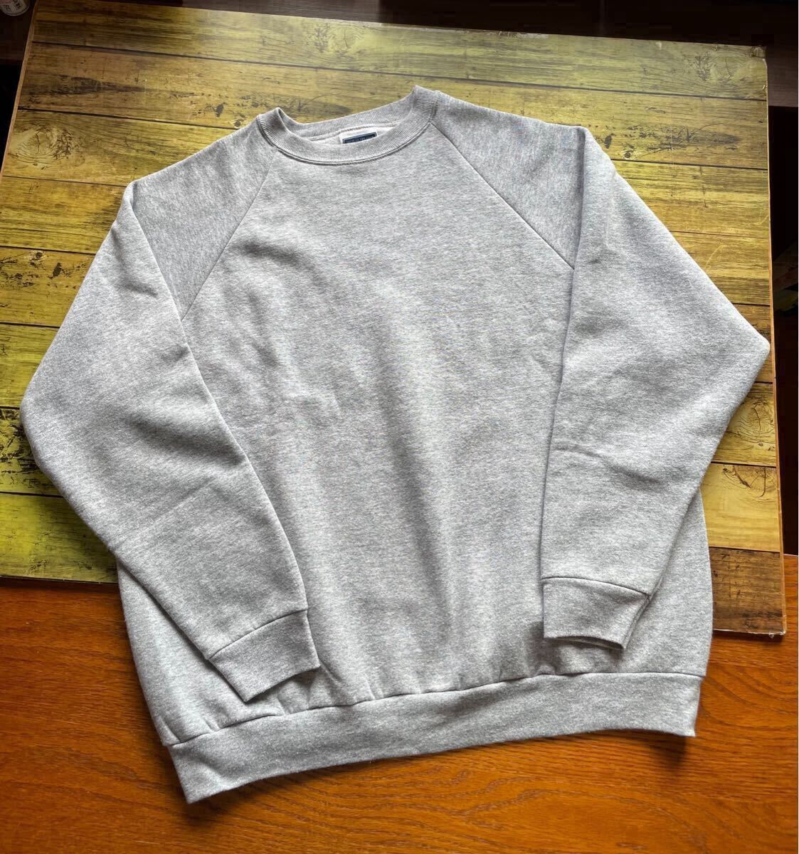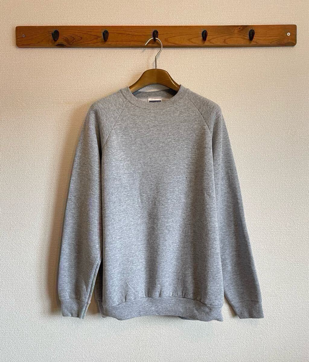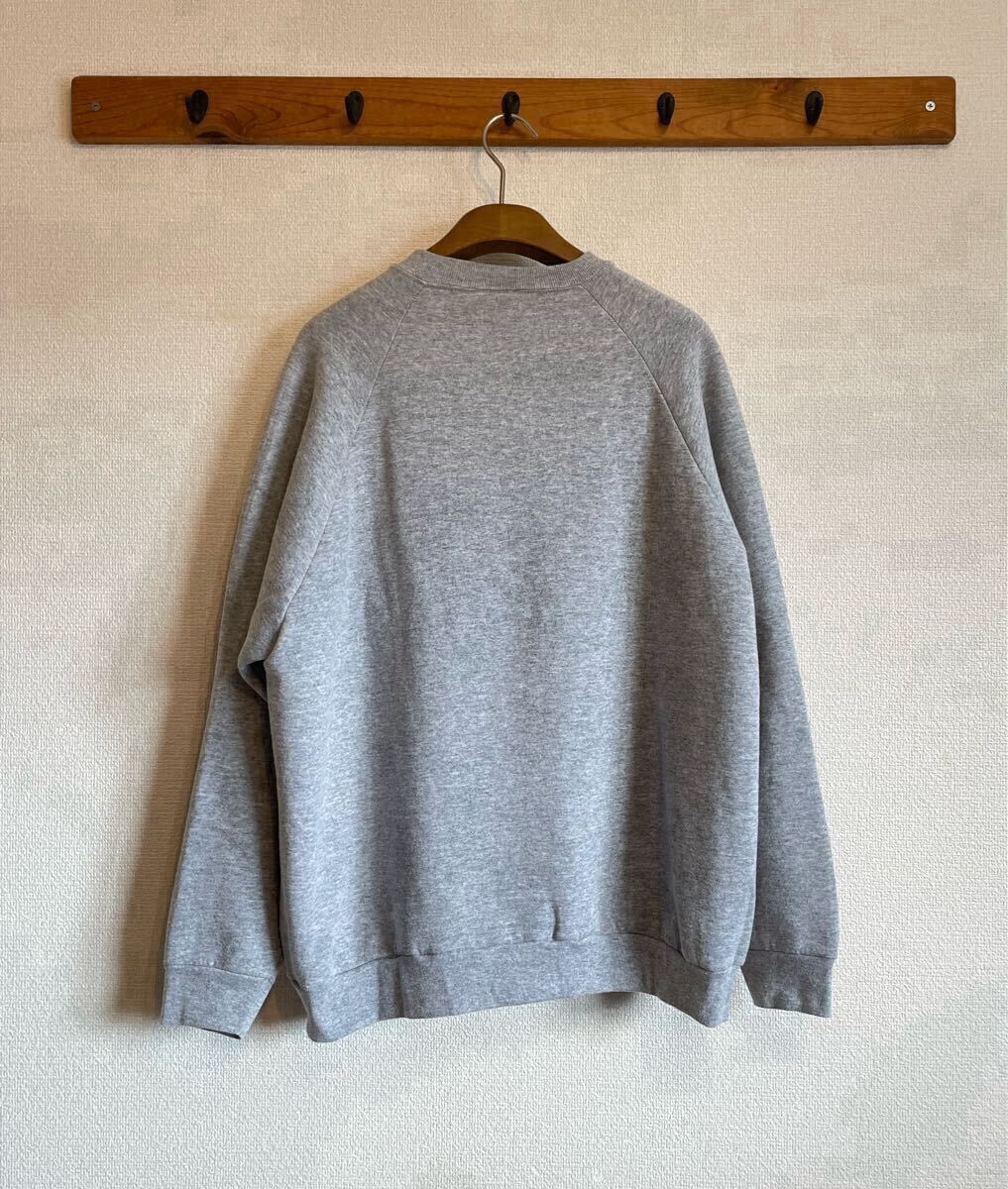 柔らかく暖かい上質なスウェット生地を使用したクルーネックトレーナーです。裏起毛なので軽くてとても暖かい着心地です。ビンテージ感のあるヘザーグレーとラグランショルダーが違いを感じさせます。ネックのヨレなどもなく、着用感の少ない美品状態です。