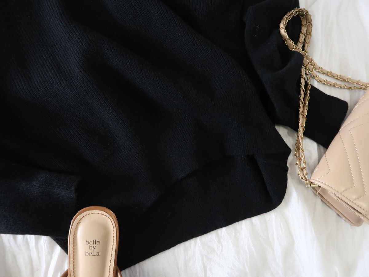 ウール×カシミヤのニットは首元を美しく見せ、すっきりとした印象を後押し。
