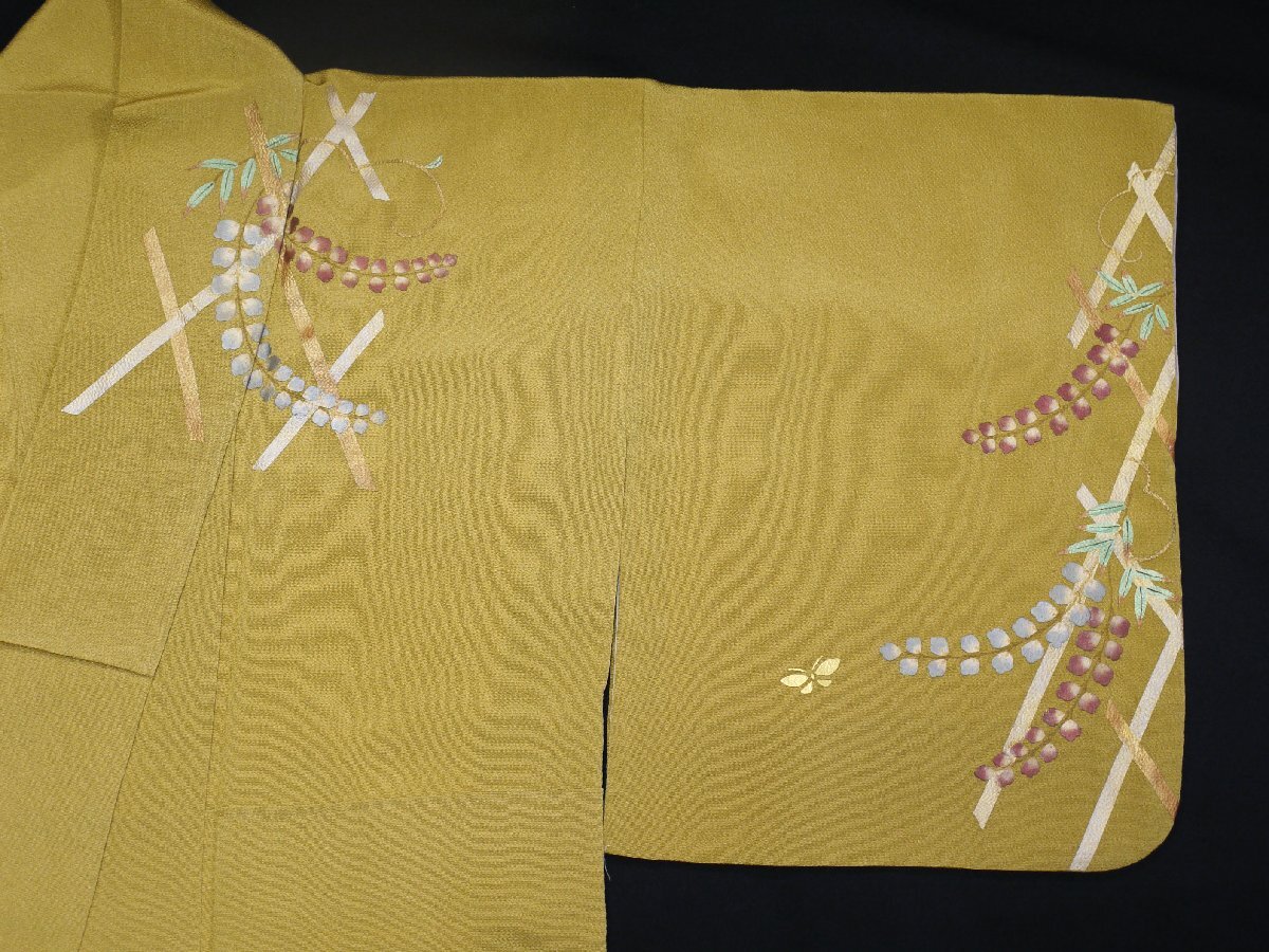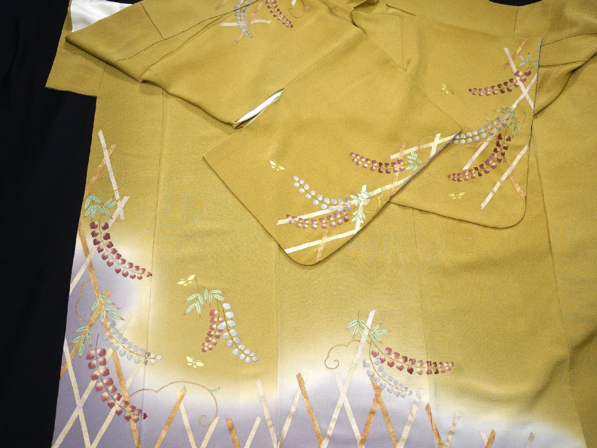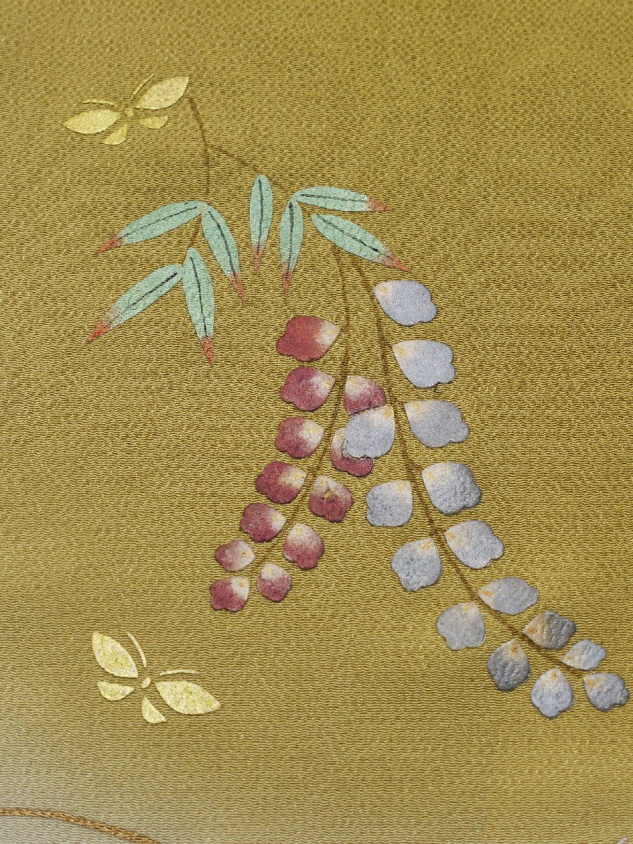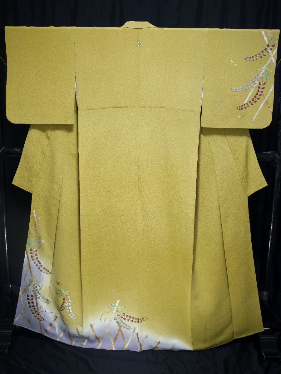 | 商品名 | 付下【ホリヒロシ】縮緬 辛子色地 裾に浅紫暈し 金銀彩で藤と蝶・163㎝ 51021 |