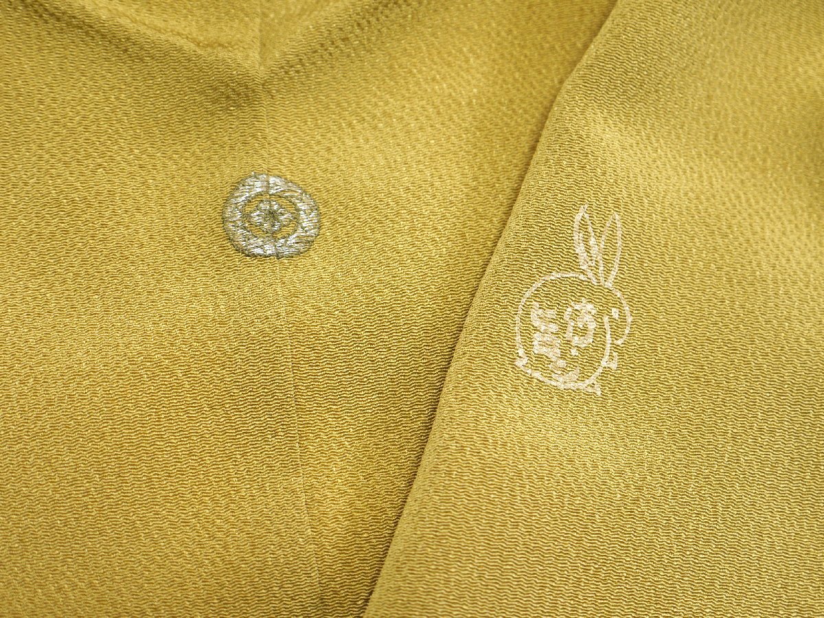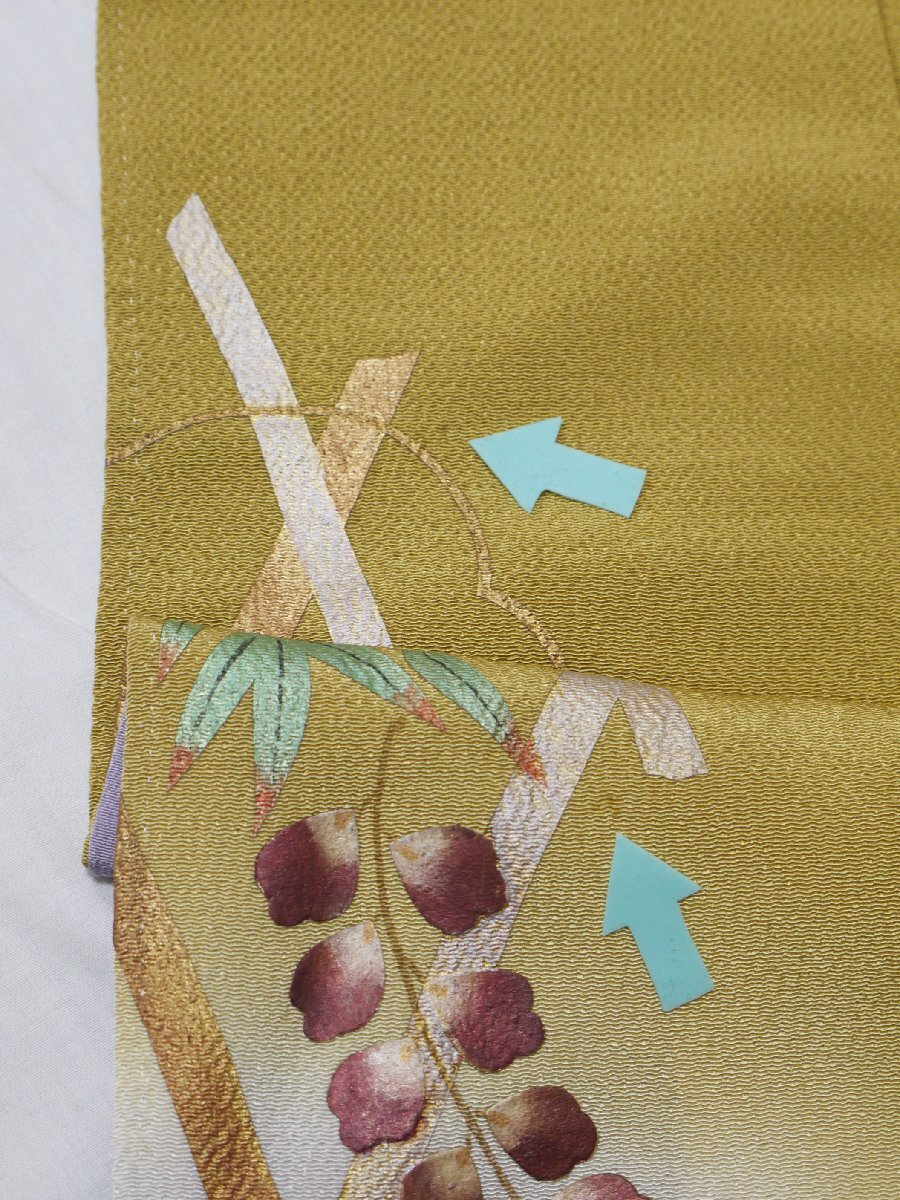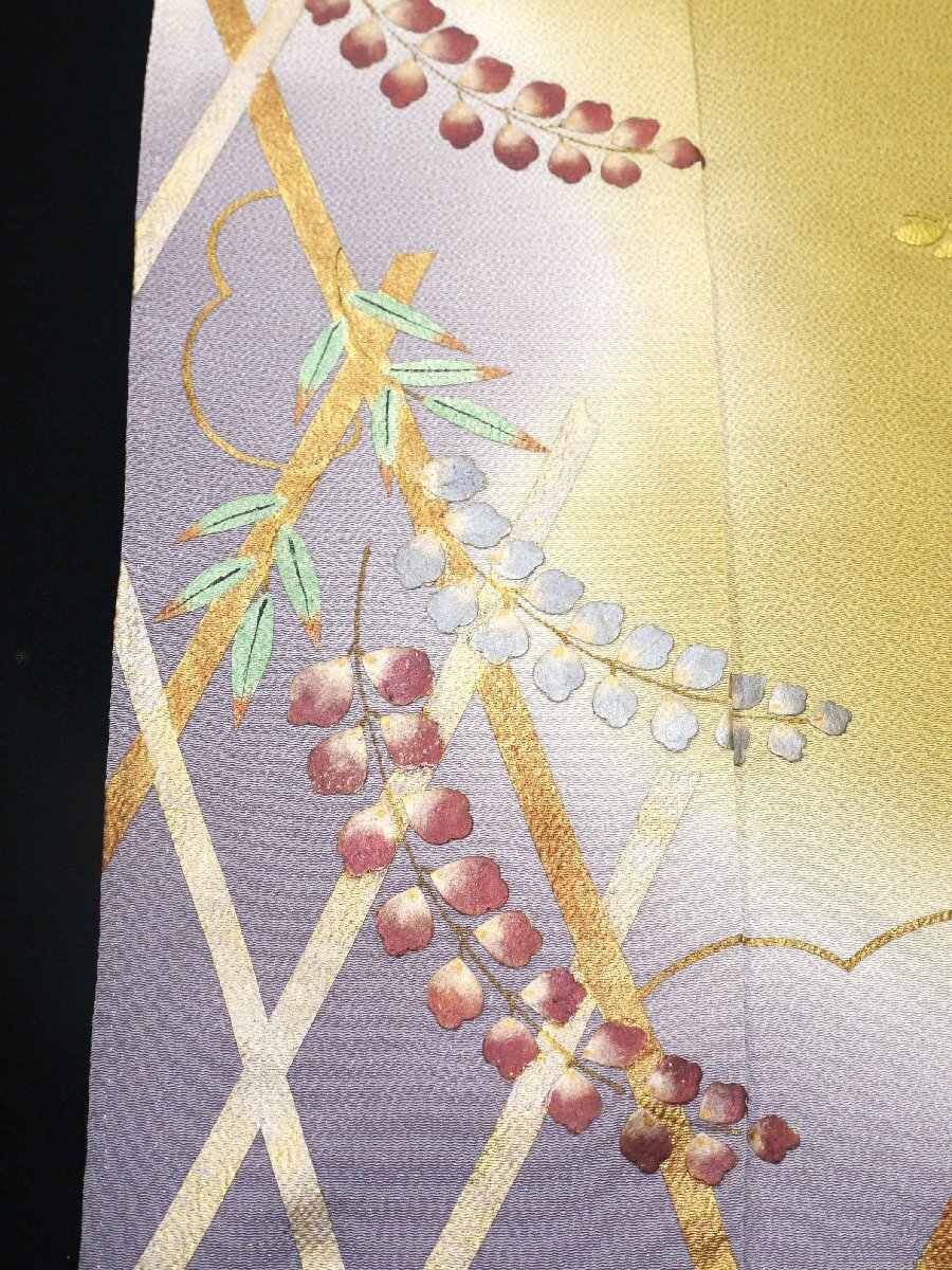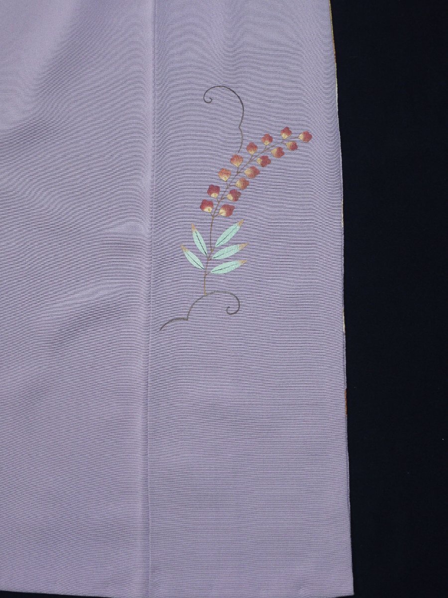 | 商品名 | 付下【ホリヒロシ】縮緬 辛子色地 裾に浅紫暈し 金銀彩で藤と蝶・163㎝ 51021 |