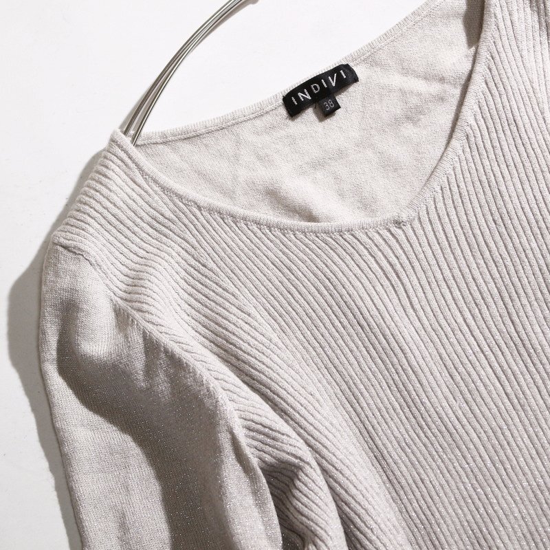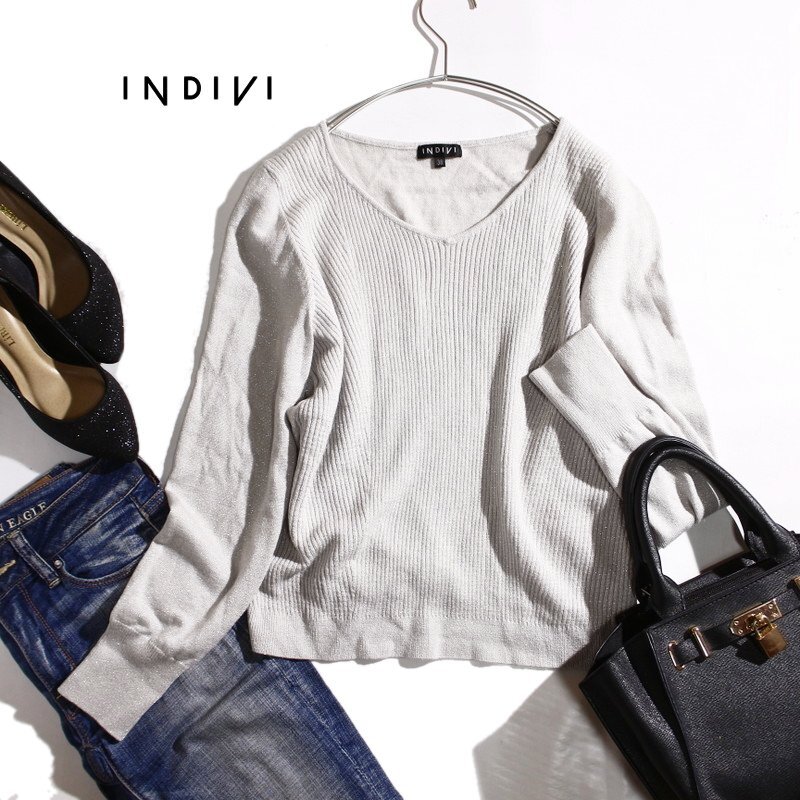自分らしさを大切にする女性たちに向けたブランド「INDIVI(インディヴィ)」のVネックニットです。 繊細なラメが織り込まれており、動くたびに上品な煌めきを放ちます。ソフトで柔らかな風合いのリブニット素材で、着心地も抜群です。深すぎないVネックラインがデコルテをきれいに見せ、シャープで洗練された印象を与えます。パンツにもスカートにも合わせやすいので、オフィスからデイリーまで幅広く活躍する一着です。