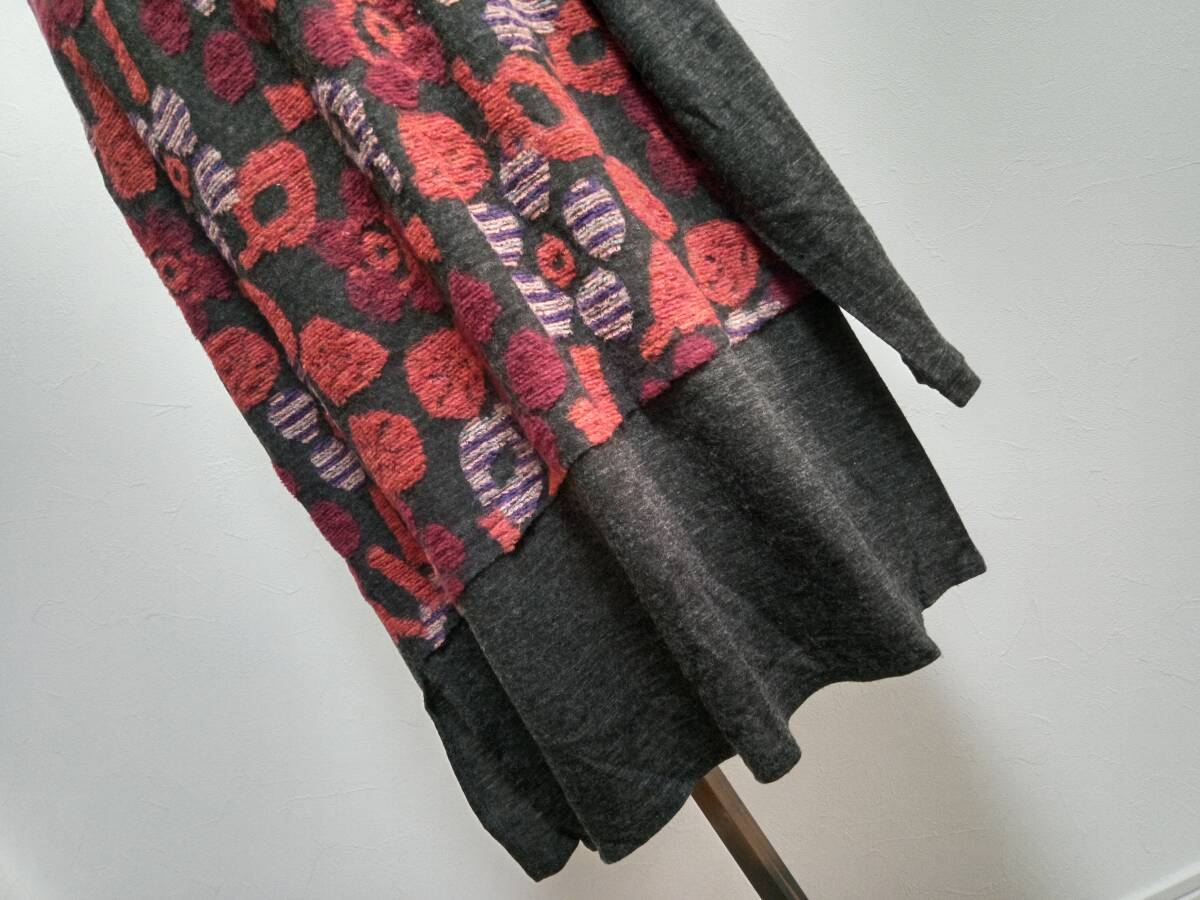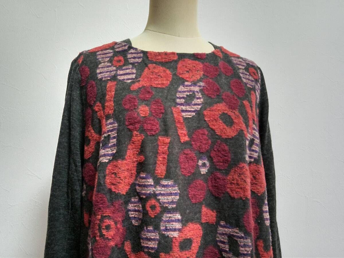 (株)セラピ 大きいサイズ44 ダークグレー 赤系 ジャガード ウール カットプルオーバー クリーニング済 美品!