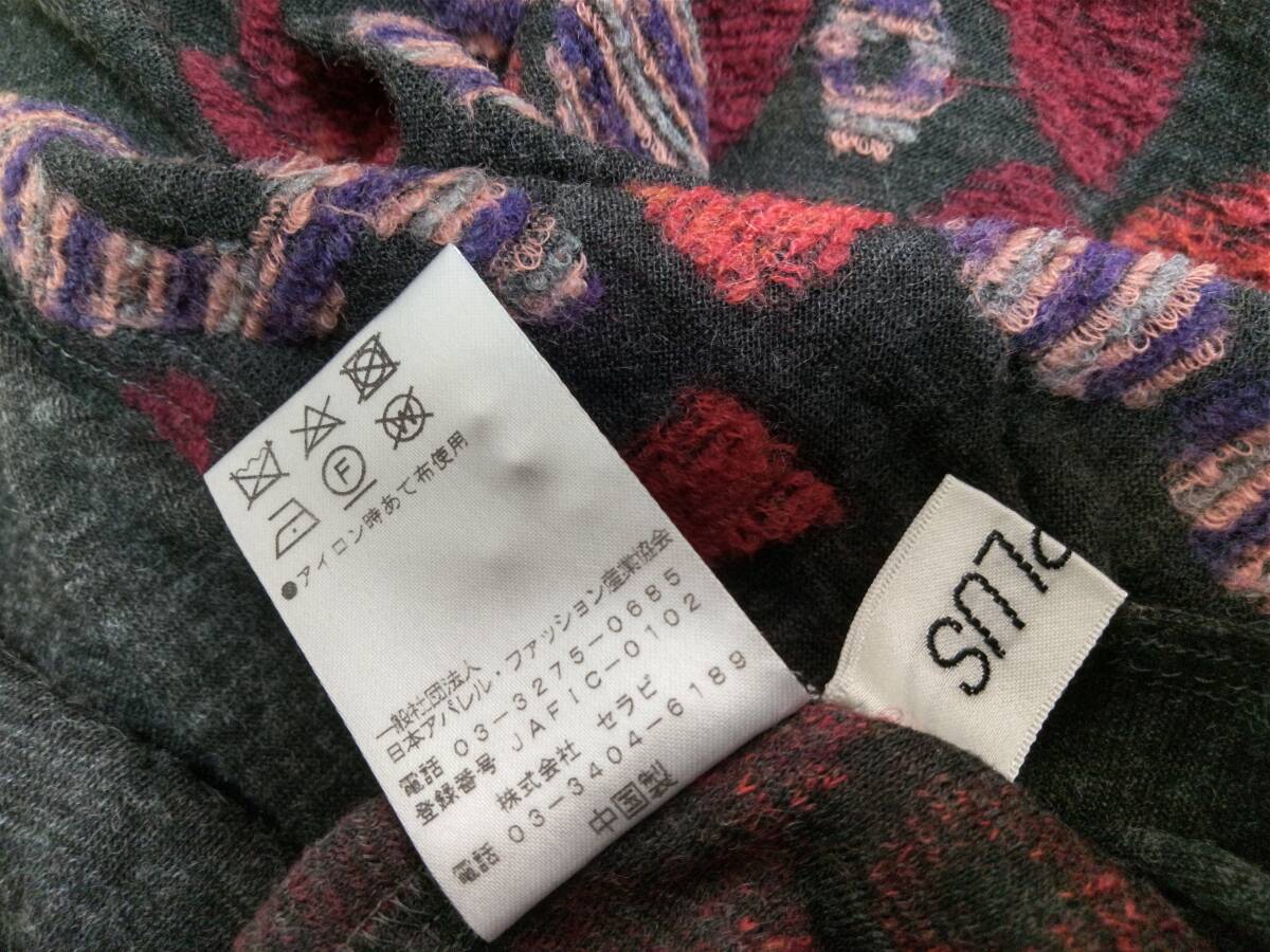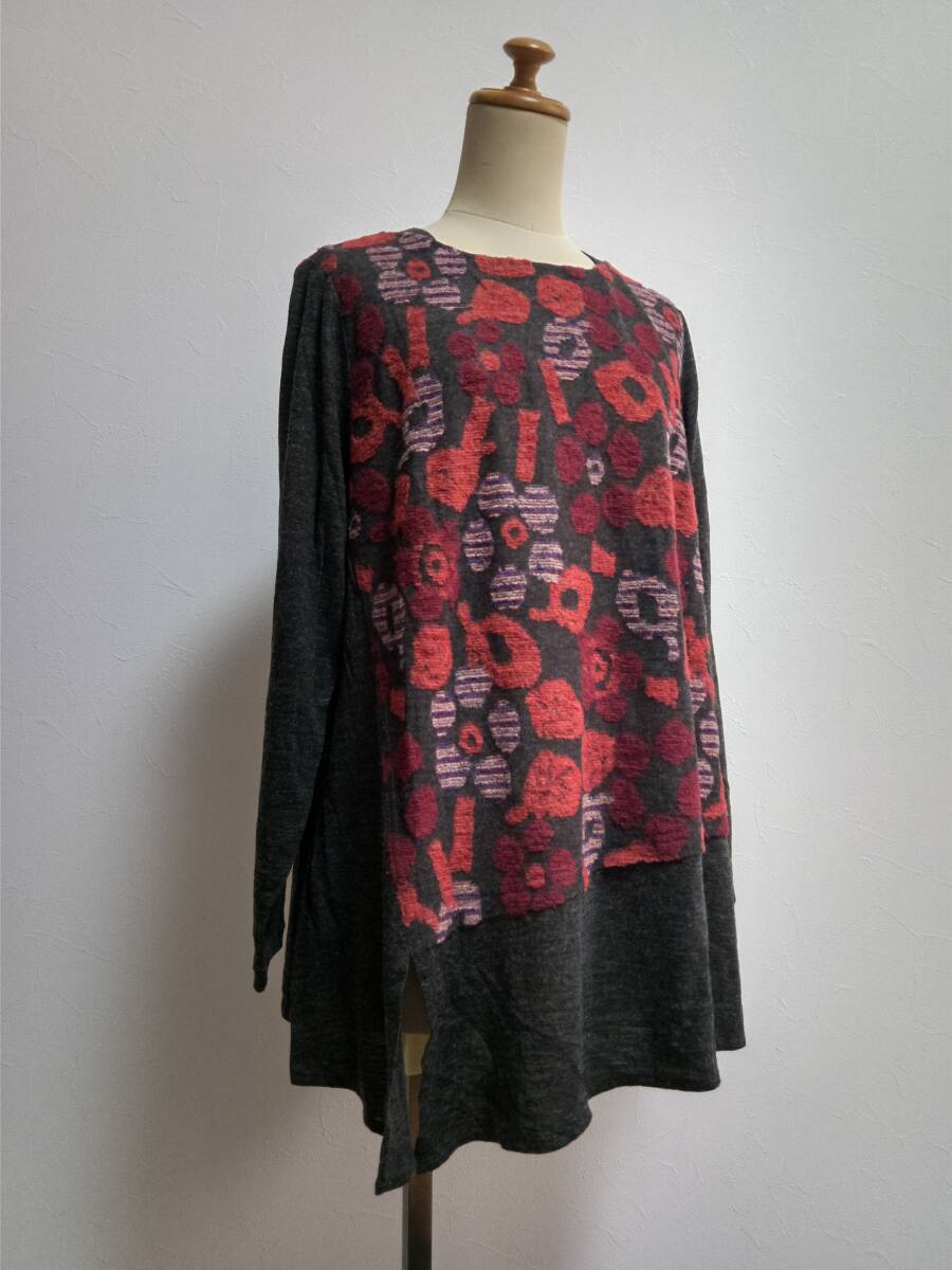 AMPLUS アンプラス(株)セラピ 大きいサイズ44 ダークグレー 赤系 ジャガード ウール カットプルオーバー クリーニング済 美品