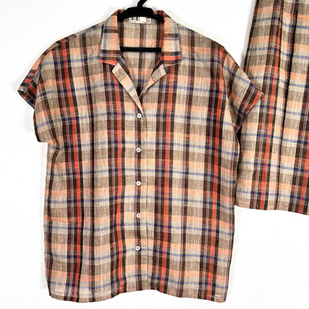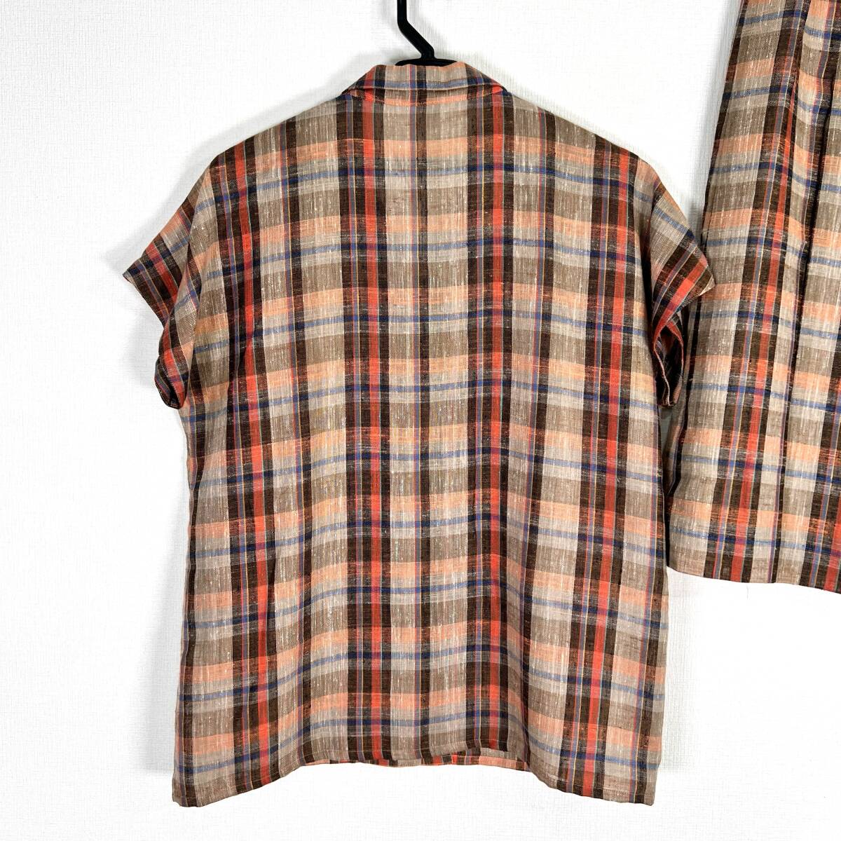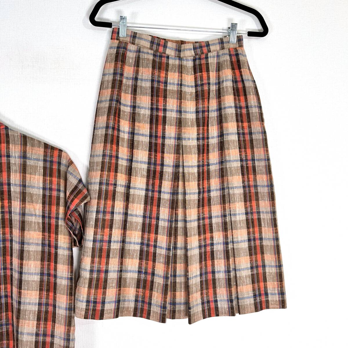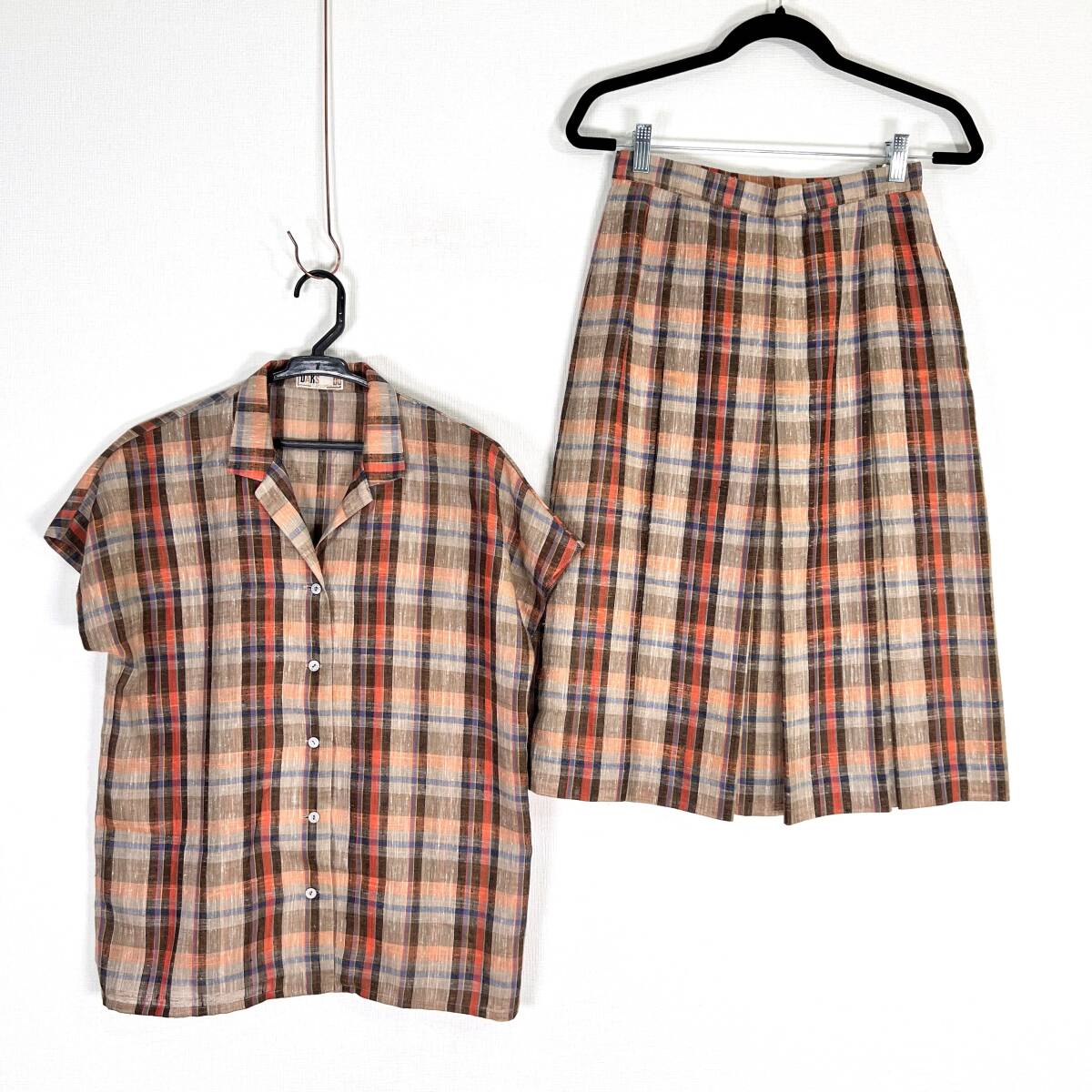 【DAKS】ダックス ブラウン系 チェック柄 リネン混 半袖 ブラウス×ロングスカート セットアップ レディース 11号 66-92【c033】