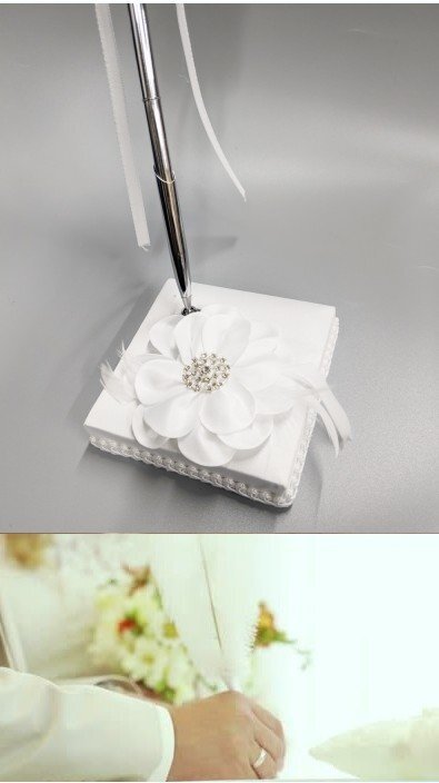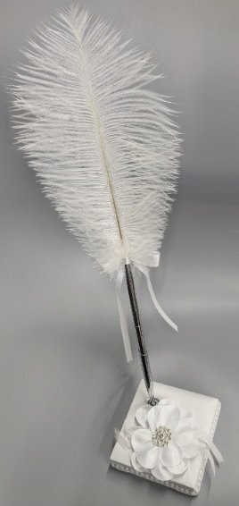 エレガントな白い羽のペンとペンスタンドのセットです。 |