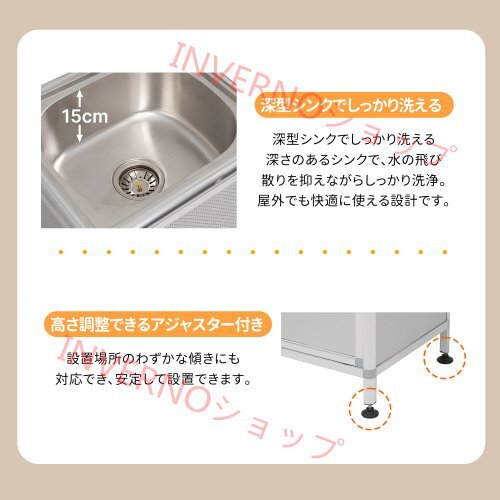 • ◎03【囲い付きでスッキリ!ステンレス製流し台】アルミ製の囲いパネルでしっかり目隠し。外から見えてほしくない物もすっきり隠せます。囲い付きの2段棚で、洗剤やバケツなどを使いやすく収納でき、まわりも清潔感のある印象に。(各段耐荷重20kgで、たっぷり収納OK!)