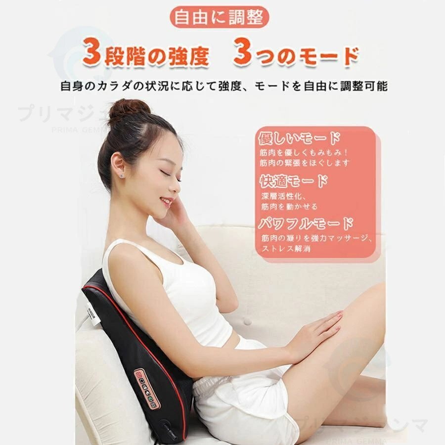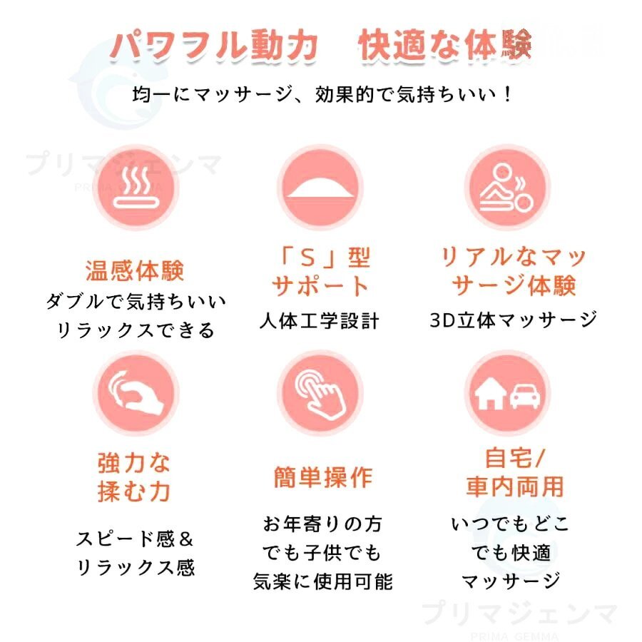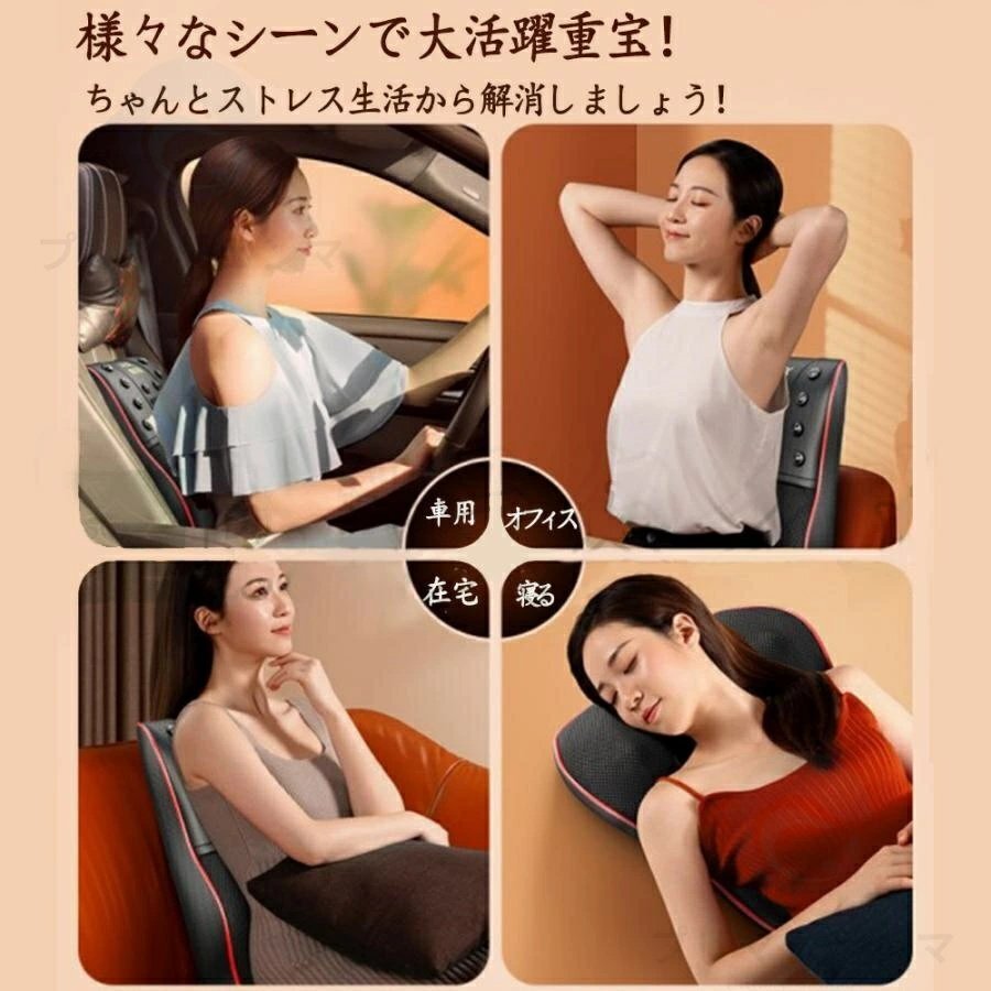 おすすめのポイント:三段階調節/ヒーター付/家庭・車載両用可能/コンパクト/簡単操作/3D揉み玉/人の手を模擬する/温熱機能/スマホ首を予防する/タイマー/人体工学設計/多機能/通気性良い/変形しにくい