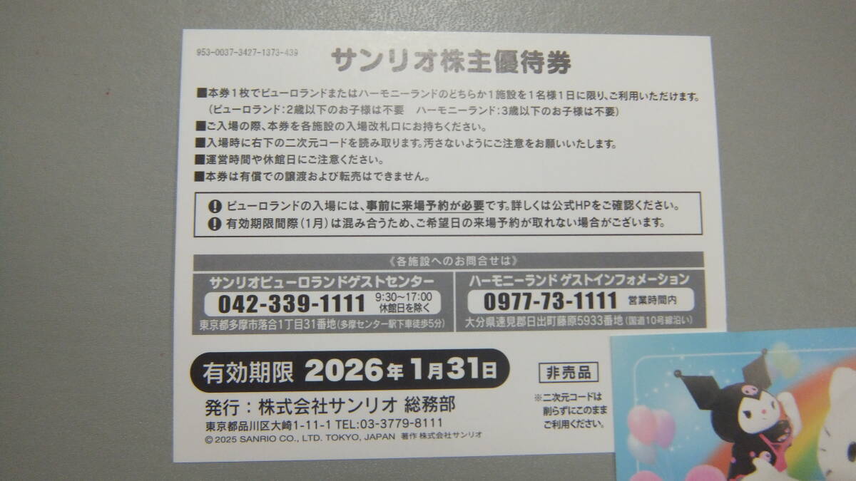 サンリオ 株主優待券 2枚セット 期限1月31日まで 匿名発送料込