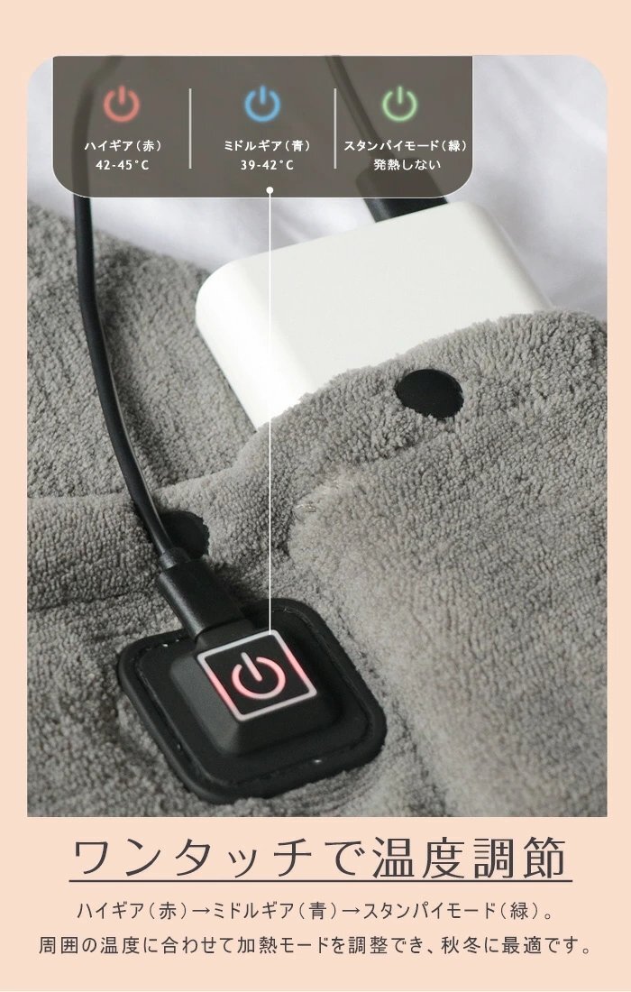 【3段階温度調整 】電気ひざ掛け毛布はUSB給電式で、出力5V/2A以上のusb充電器やモバイルバッテリーを使用すれば、場所や時間を問わず簡単に使えます。スイッチを3秒長押しすると、高温モードに入り、赤ランプが点灯します。スイッチを押すたびに、温度が高(赤42-45°)→中(青39-42°)→(緑スタンパイモード)温に切り替わり、秋冬に最適です。周りの状況とご自身の感覚で温度選べます。※ご注意:商品に電源は含まれない。