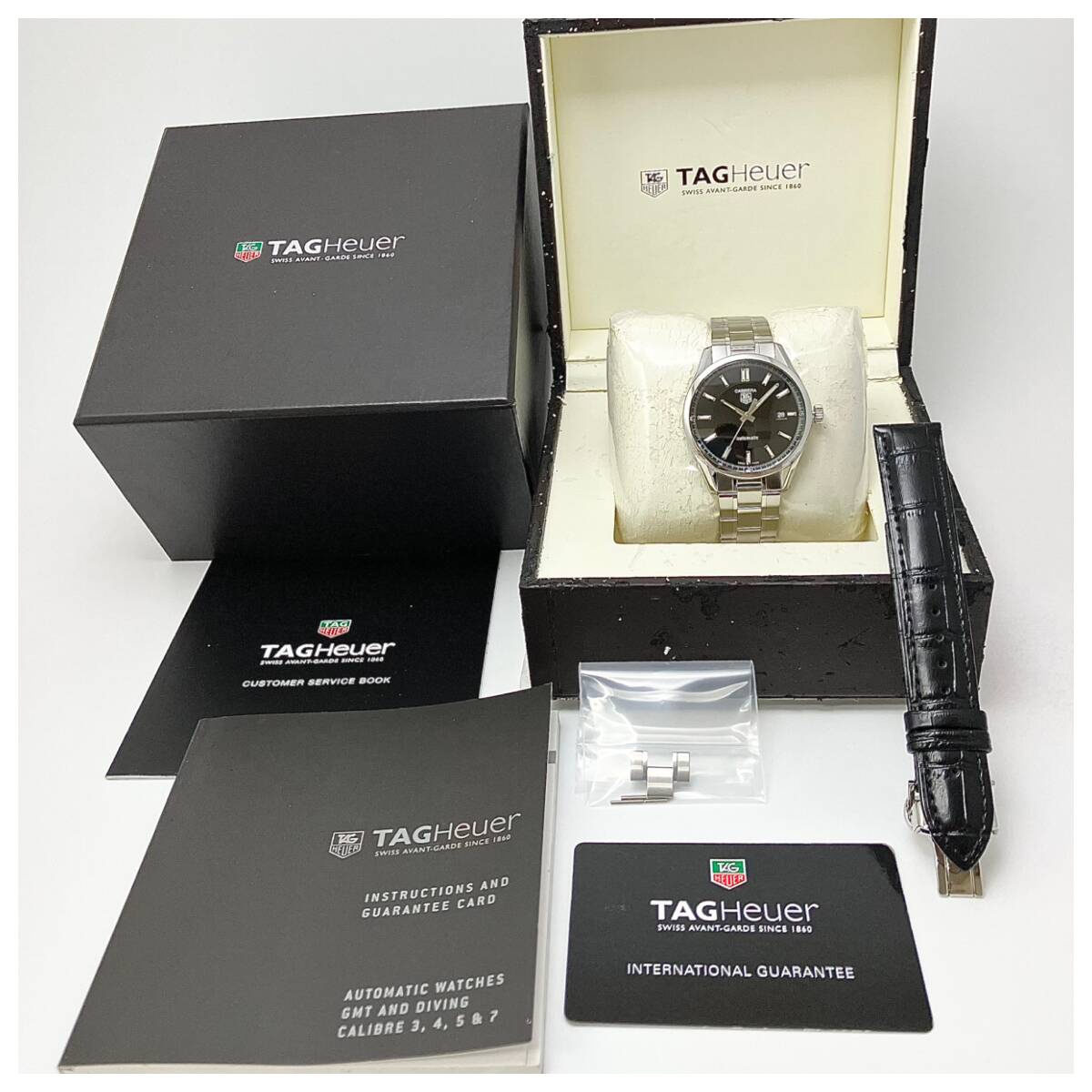 付属品全部、ベルト2種付き☆OH済み極美品のタグホイヤー時計カレラ・キャリバー5・黒盤☆WV211B-2☆