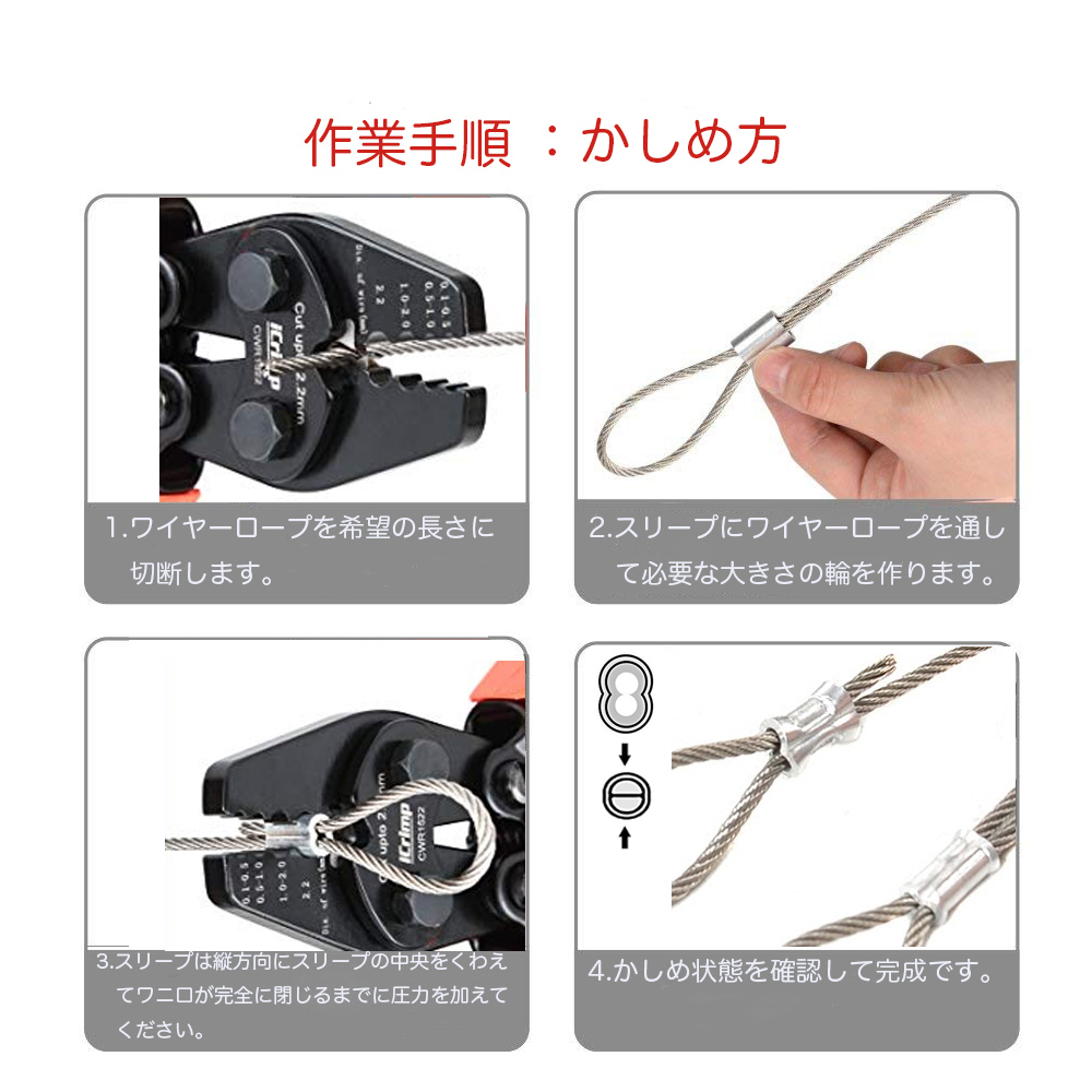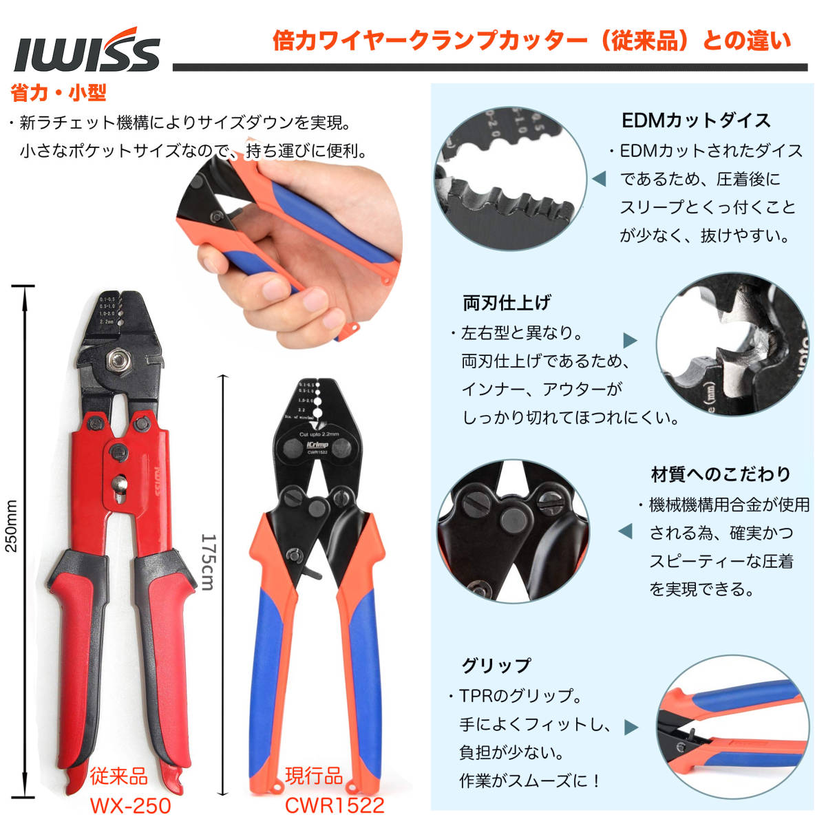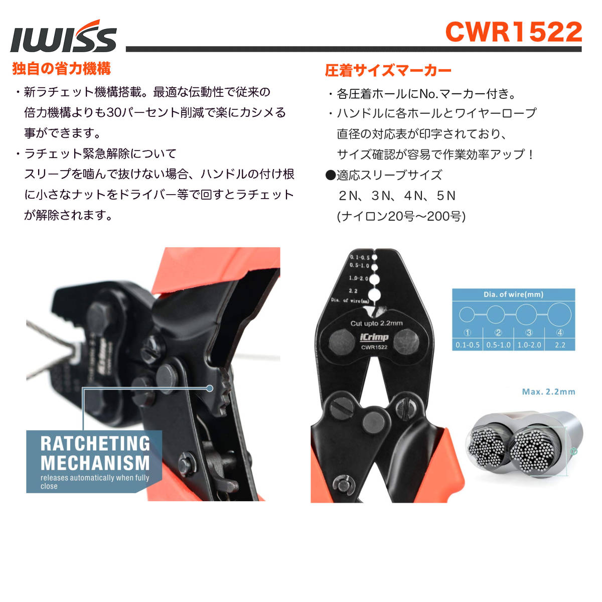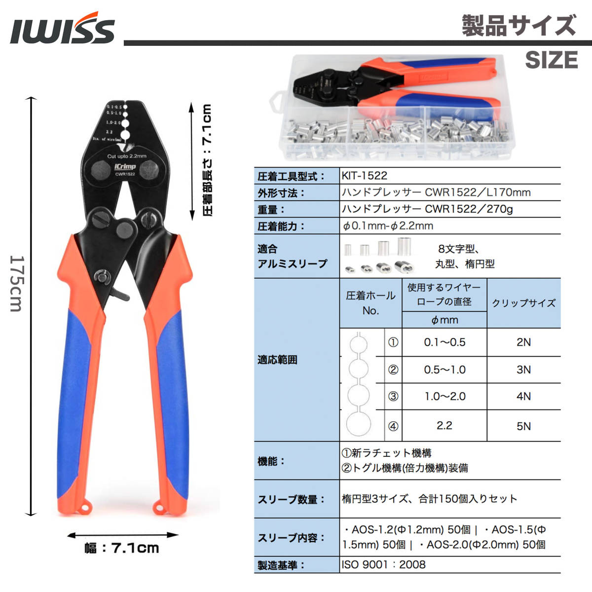 直径がφ0.1mm〜φ2.2mmのワイヤーロープの切断とクランプ(圧着)用。φ1.2mm〜φ2.0mmのアルミスリーブ計150点付きです。 こちらのハンドプレッサー CWR-1522は従来品(WX-250)と比べ、ラチェット機能およびラチェットロック解除機能を装備させて改良し、使い勝手がより良くなったものです。深海の大物、トローリングなどで大型青物を狙うワイヤー仕掛け、あるいは極太ナイロンの仕掛け作りに欠かせないスリーブ止めに必要なツール。 圧着能力:φ0.1〜0.5mm、φ0.5〜1.0mm、φ1.0〜2.0mm、φ2.2mm 商品長さ:170mm 重量:270g 用途:ワイヤーかしめ 適合スリープ:8文字型、丸型、楕円型のアルミスリープまたは銅製スリーブのロック加工用に。 適応スリーブサイズ :2N、3N、4N、5N(ナイロン20号~200号) ワイヤーカット対応:2.2mm迄 楕円型アルミスリーブセット内容: ・AOS-1.2(Φ1.2mm) 50個 ・AOS-1.5(Φ1.5mm) 50個 ・AOS-2.0(Φ2.0mm) 50個 用途:釣りワイヤー仕掛け、棚・額縁の吊り下げ、庭木の補正、アンテナ、看板の取り付けやタンス、食器棚の固定等に。 ※アイクリンプのワイヤー切断機CWRは全数切断テストを実施して出荷しております。切断テストにより刃に切断ワイヤー屑が残ることがございますがご了承くださいませ。 IWISS アイウィス「IWISS」はプライヤやペンチを主力とした工具類が販売され、ドイツやアメリカをはじめ、世界50か国以上で販売されているの人気ブランドです。 発売されたオープンバレル用圧着ペンチやワイヤペンチがEUやアメリカのECサイトでベストセラーランキングで何度も1位になっている大ヒット商品です。高品質な材料から作られたそれらの製品はその精度と実績から高い信頼を得ています。 | |||
