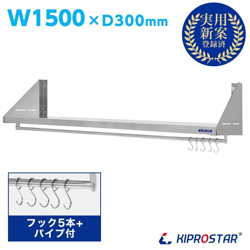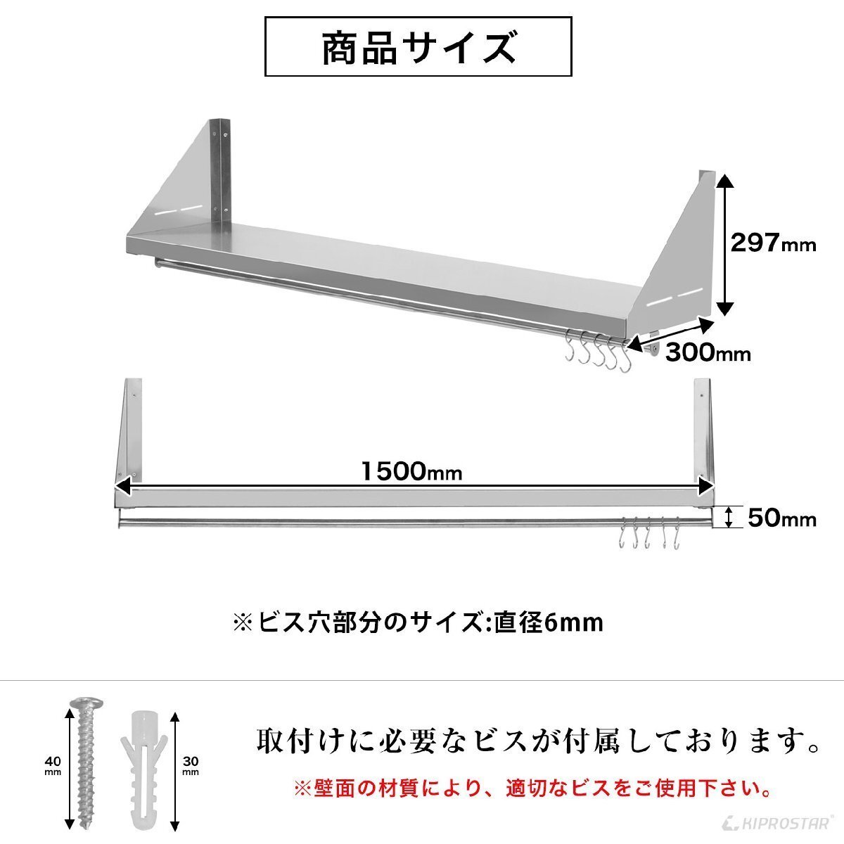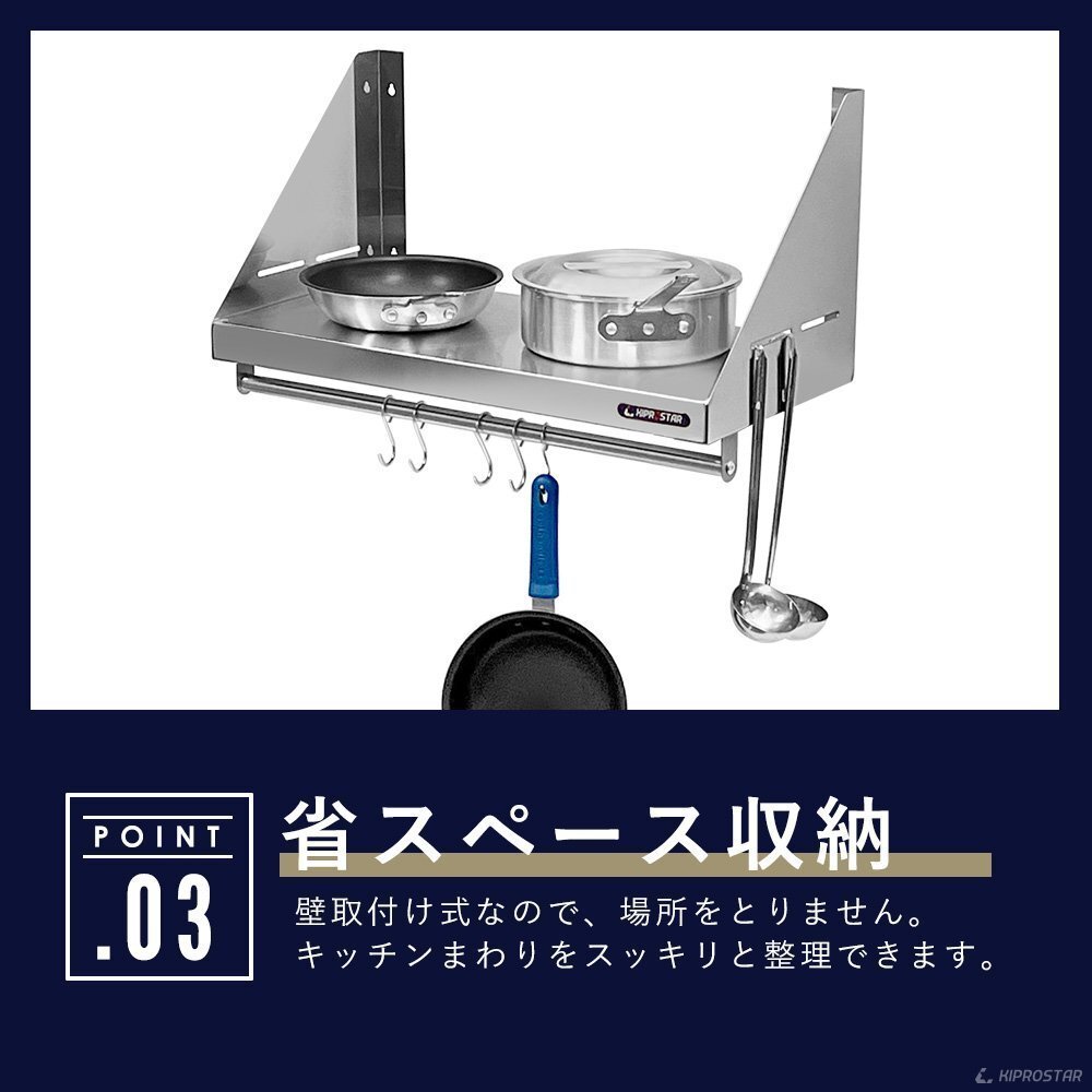 | 耐荷重 | 均等荷重50kgまで (取付強度に依存します) | 材質 | 棚板、ステイ…ステンレスSUS430/パイプ…ステンレスSUS201 |