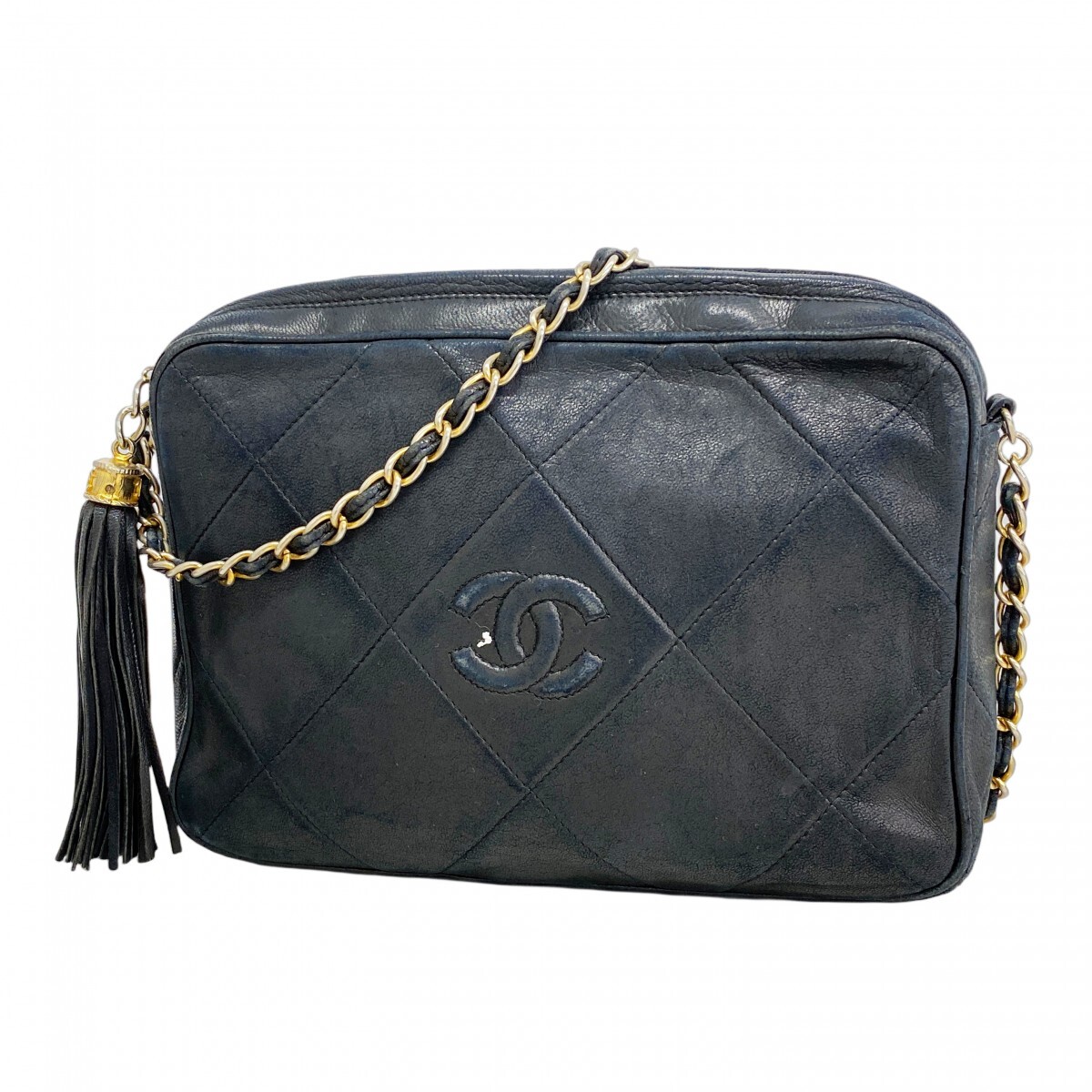 【5oe5664-h】シャネル ショルダーバッグ マトラッセ フリンジ付きチェーンショルダー ラムスキン ブラック ゴールド金具