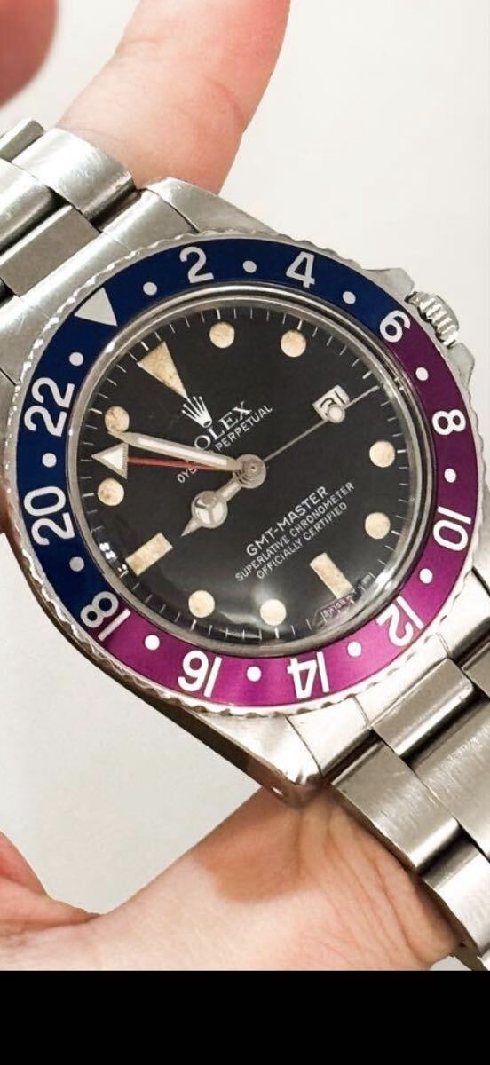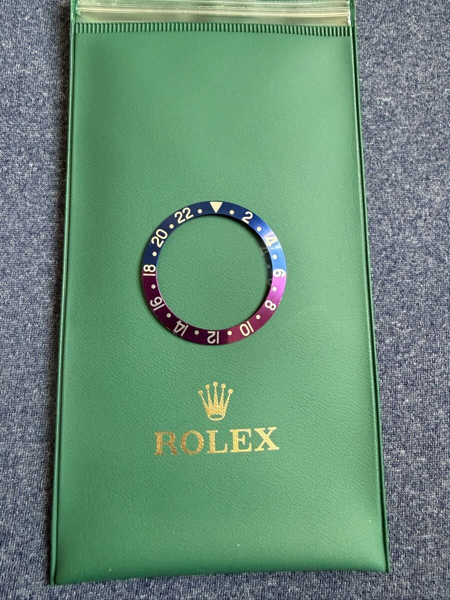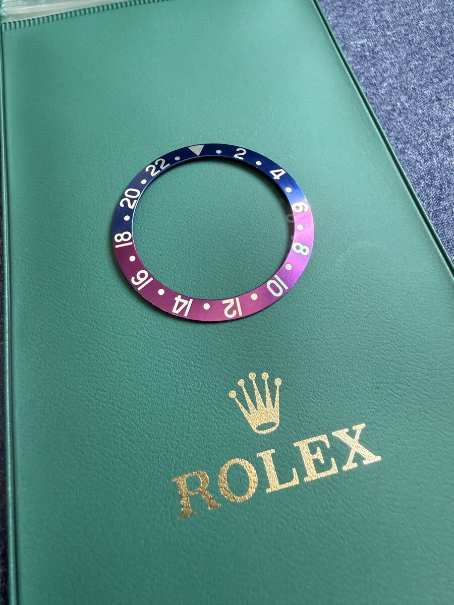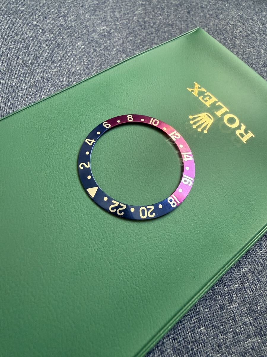 当たり前ですが、もちろんロレックス社の純正品になります。Ref.1675、16750などのヴィンテージのGMTマスターに適合します。サファイアクリスタルのモダンなGMTマスターには装着不可なのでお気をつけください。 eBayやChrono24のパーツカテゴリーでは、状態の悪いベゼル単体でも40万円前後で取引されています。 こちらとても高価な1675から外した物になります。