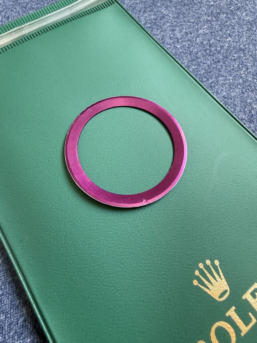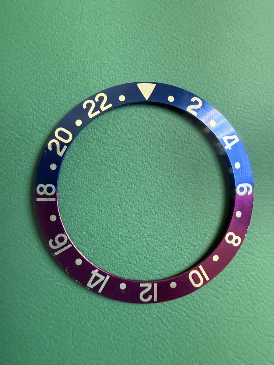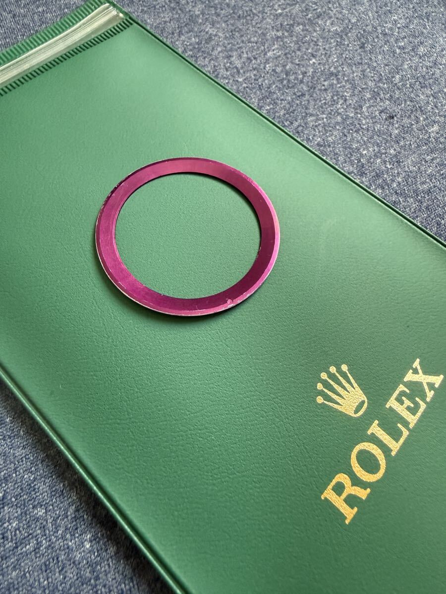 こちら1960年代のロレックス1675のヴィンテージのベゼルインサートになります。経年変化によってベゼルのレッドカラーが独特のバイオレットカラーに変化した通称ヴァイオレットベゼル、そのカラーリングからフクシアベゼルと呼ばれ世界のコレクターから幻とまで呼ばれるようになっています。 表面、裏面ともに、状態は最高です。