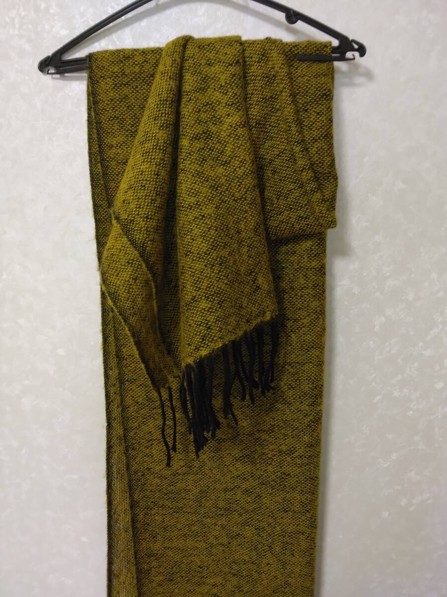 ウール混紡素材のフリンジ付きストール、カジュアルなスタイルに最適。