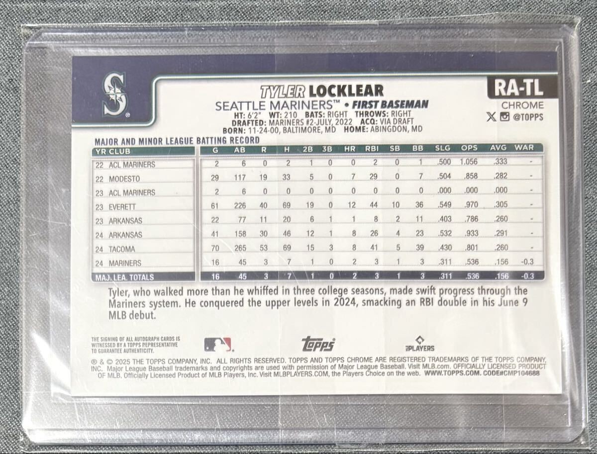 マリナーズのルーキー、ロックリア選手の直筆サインカードを出品いたします。