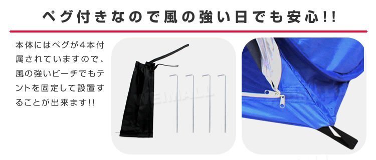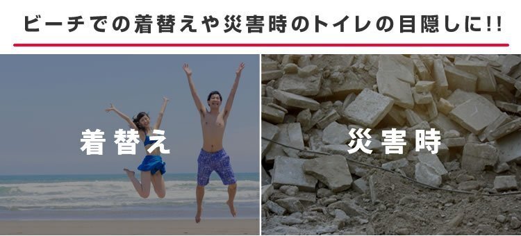 | 海水浴やアウトドアでの着替えに! 女性やお子様でも1人で簡単に設営できる どこでも着替えが出来る着替え用のテントです。 足元のひもを踏んで横倒れ防止できます! キャンプや海や川などに行ったときに、車内での着替えは狭くて辛い! でもこのテントがあればどこでも着替えができるので便利です♪ 中はゆったり広々で大人でも楽に着替えができます! 災害時には中に簡易トイレなどに設置としてトイレとして使うこともできます! アイデア次第で使い方が広がる簡単テントです! | ||