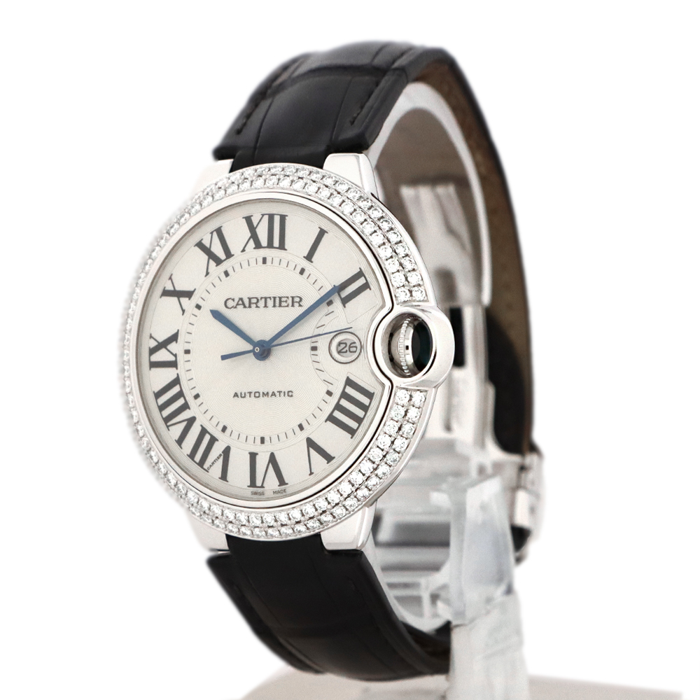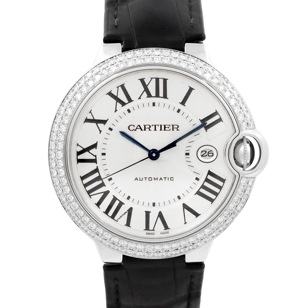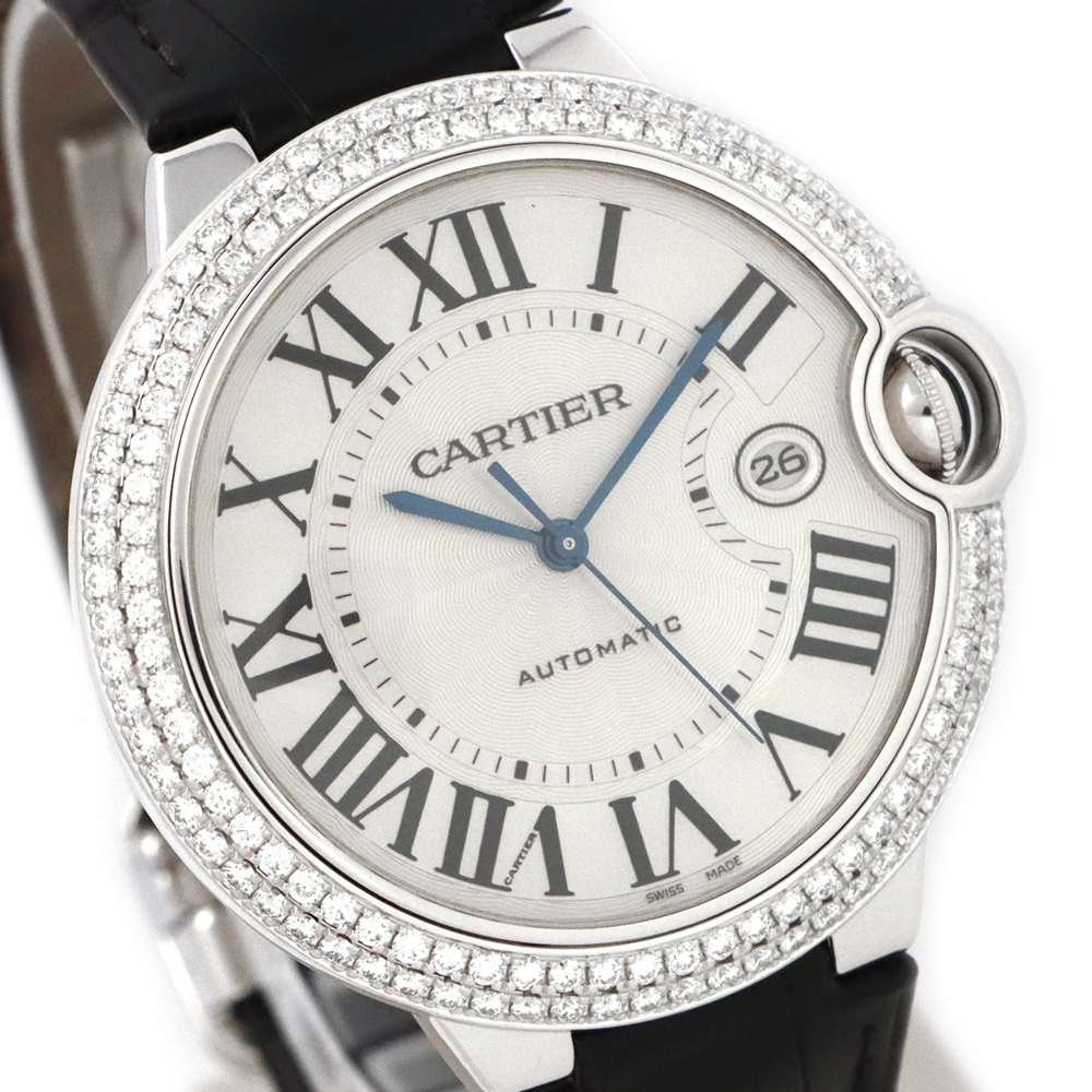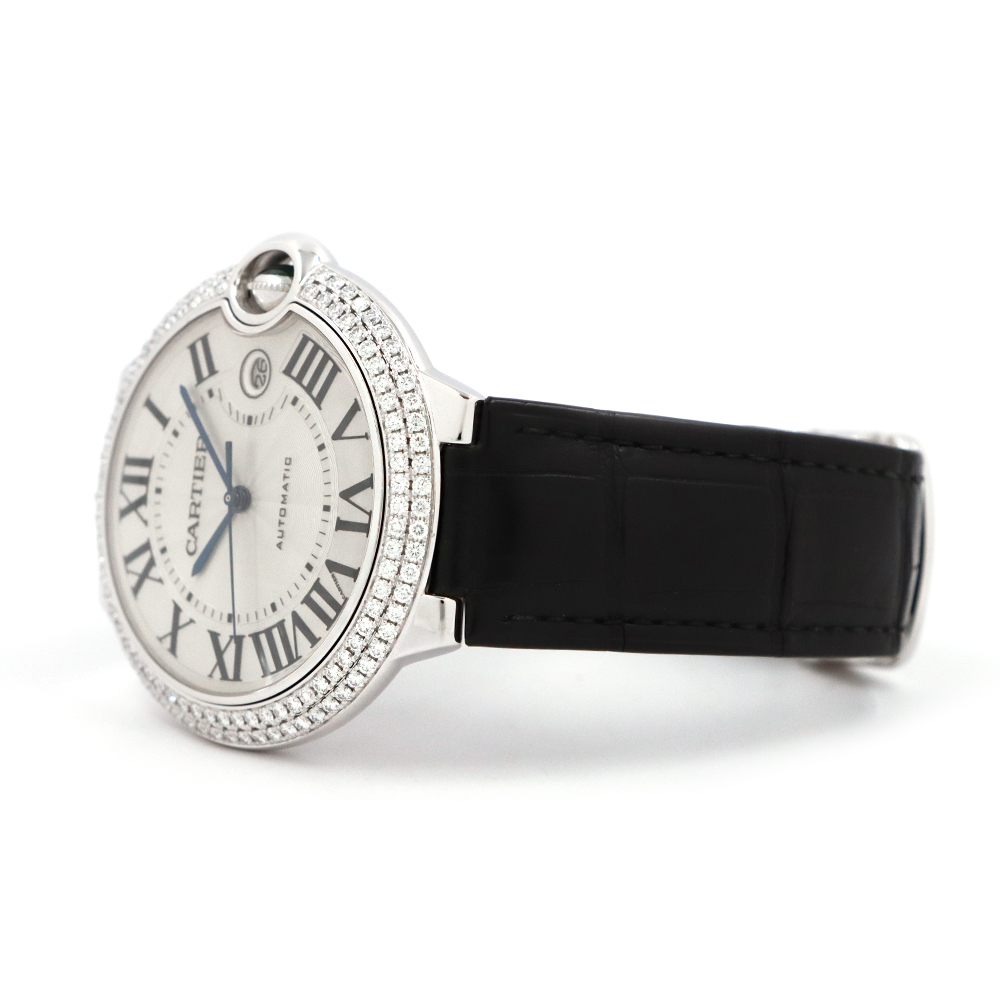こちらはバロン ブルー ドゥ カルティエ。バロン ブルーの最大の特徴は、ケースの前後両面がドーム状に膨らんだ、まるで風船のような丸みを帯びたフォルムです。この曲線的なデザインが、手元に優しくフィットし、柔らかく上品な印象を与えます。ケースとバックルに18Kホワイトゴールドを使用し、ベゼルにはカルティエ純正となる大粒の美しいダイヤモンドがセッティングされております。カルティエのエレガンスとバロン ブルーのユニークなデザインが、ダイヤモンドの輝きによって一層引き立てられた、非常に美しいタイムピースと言えるでしょう。