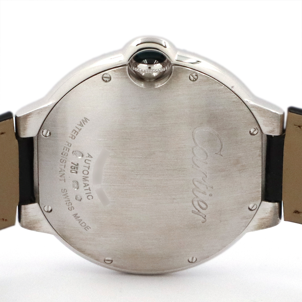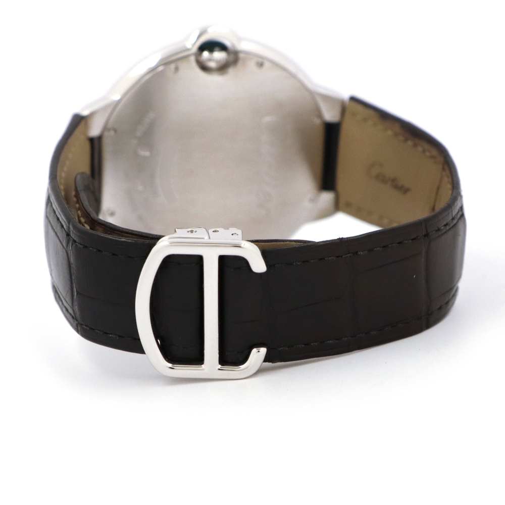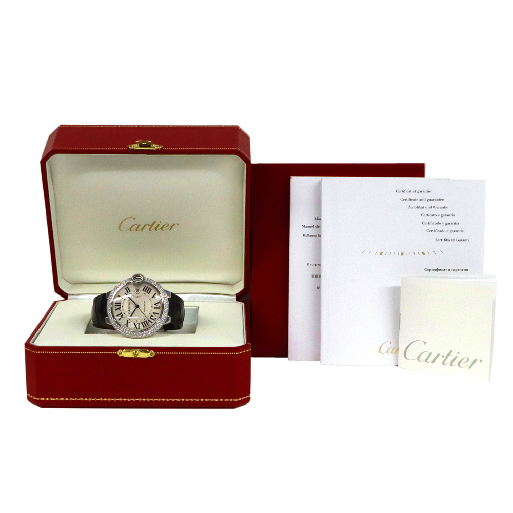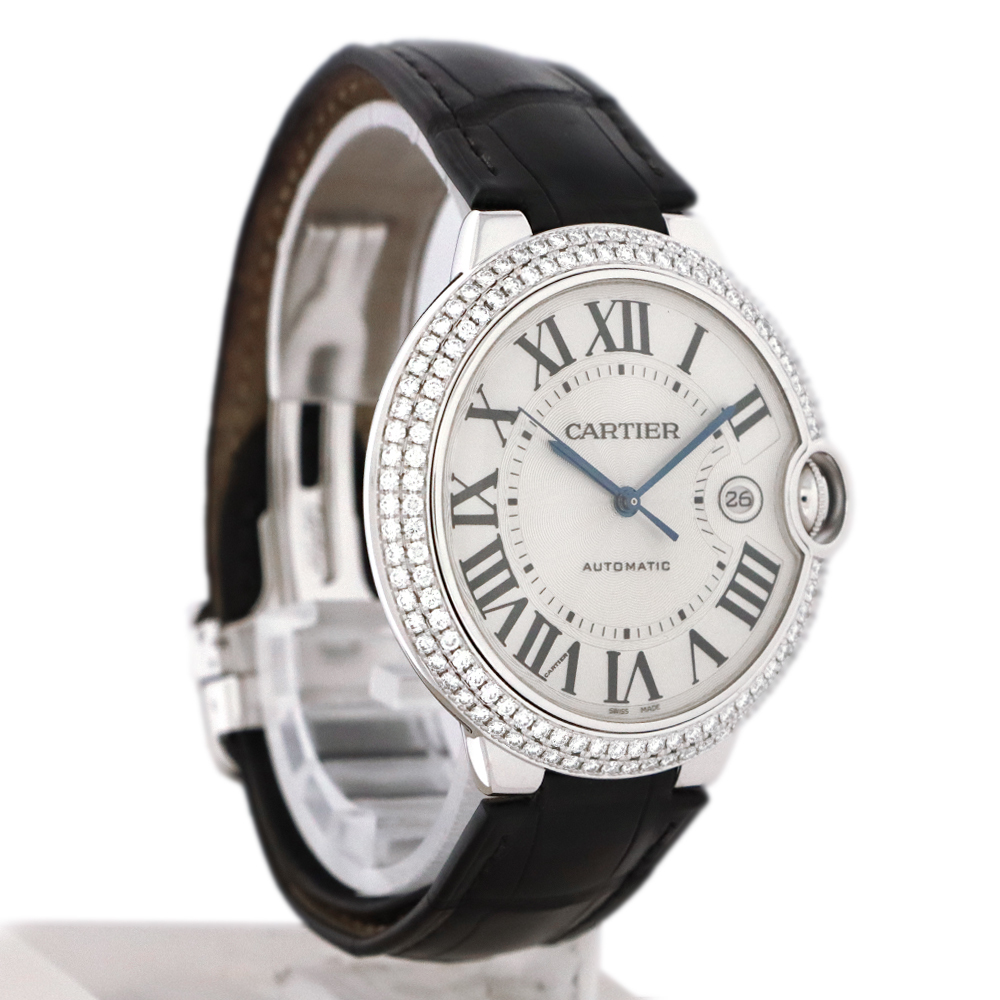 こちらはバロン ブルー ドゥ カルティエ。バロン ブルーの最大の特徴は、ケースの前後両面がドーム状に膨らんだ、まるで風船のような丸みを帯びたフォルムです。この曲線的なデザインが、手元に優しくフィットし、柔らかく上品な印象を与えます。ケースとバックルに18Kホワイトゴールドを使用し、ベゼルにはカルティエ純正となる大粒の美しいダイヤモンドがセッティングされております。カルティエのエレガンスとバロン ブルーのユニークなデザインが、ダイヤモンドの輝きによって一層引き立てられた、非常に美しいタイムピースと言えるでしょう。