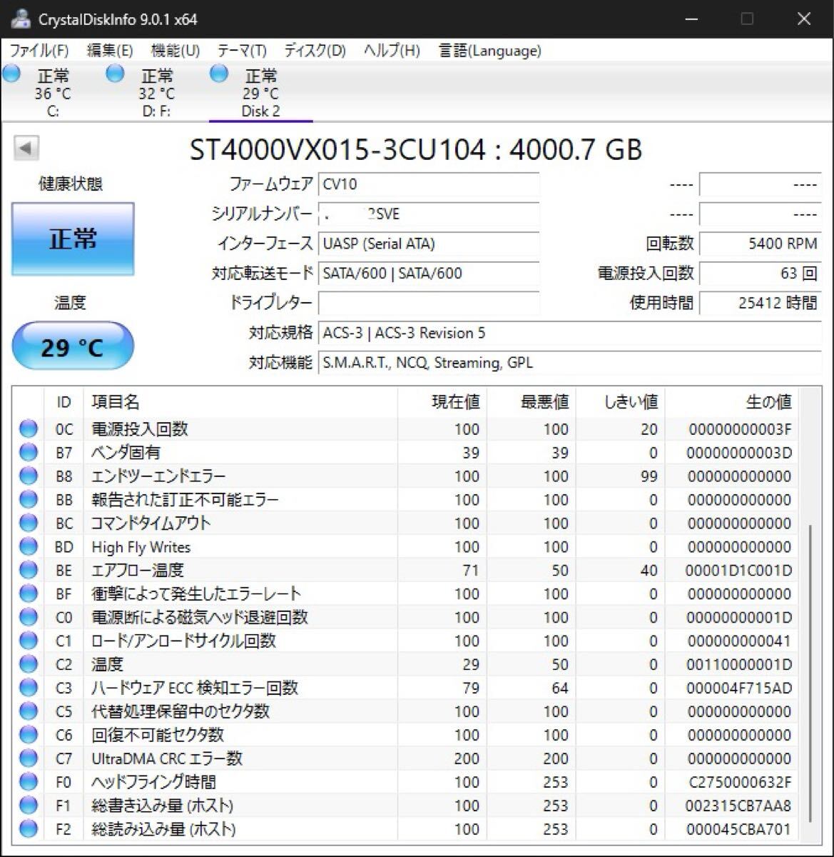 【美品・健康状態良好】Seagate ST4000VX015 4TB HDD