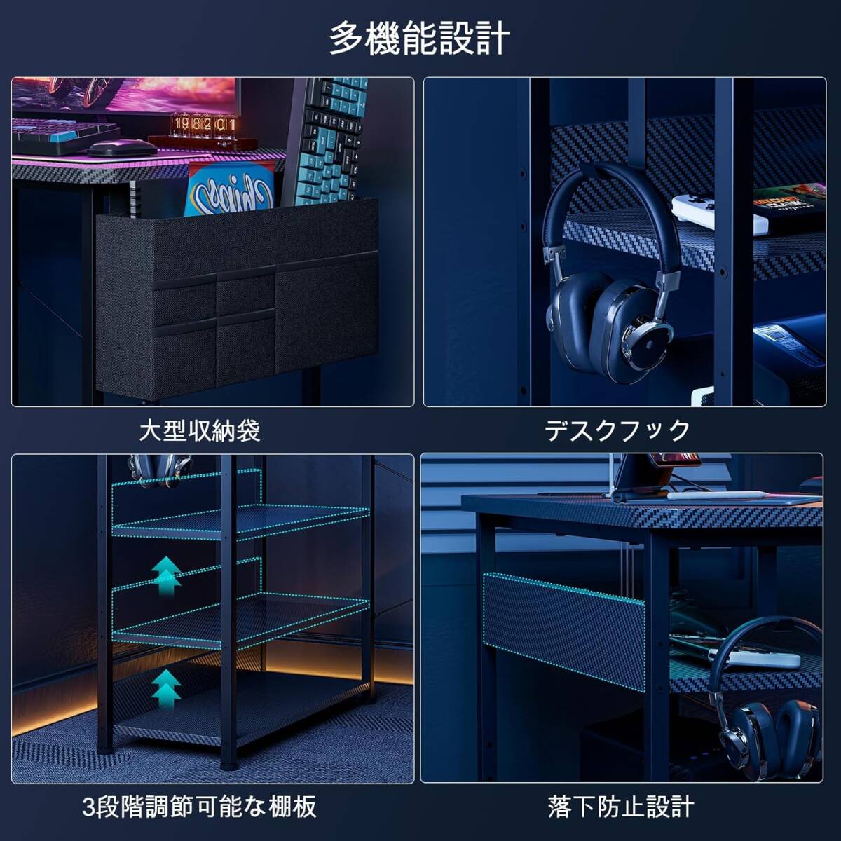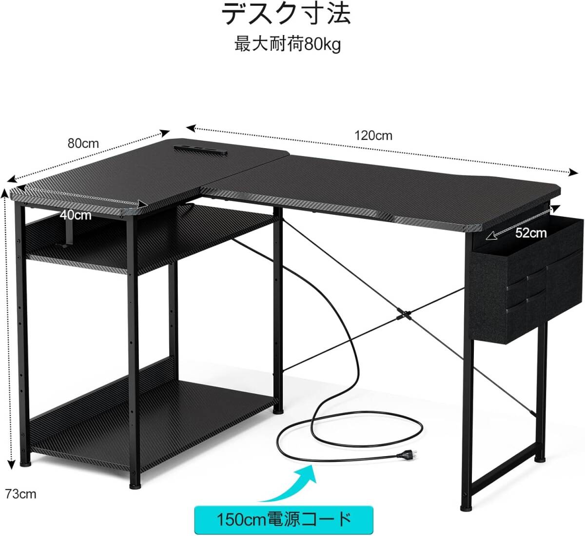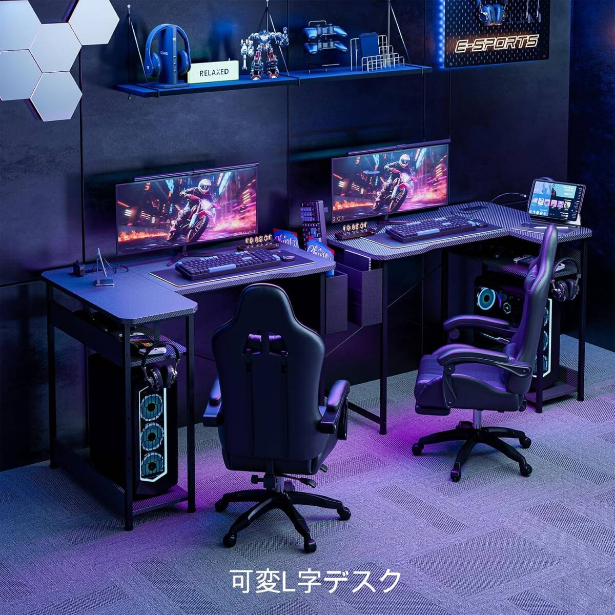 ゲーミングデスク L字デスク 黒カーボン板 左右入替OK 収納バッグ付き コンセント付き 幅120 cm 棚高さ調節可能 棚付き ゲームワークデスク