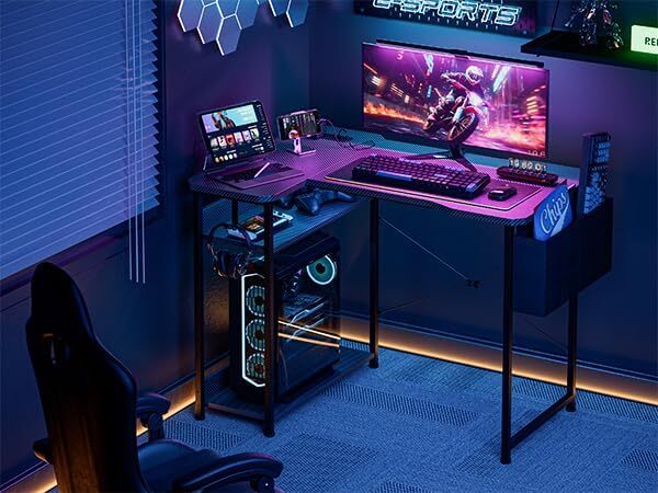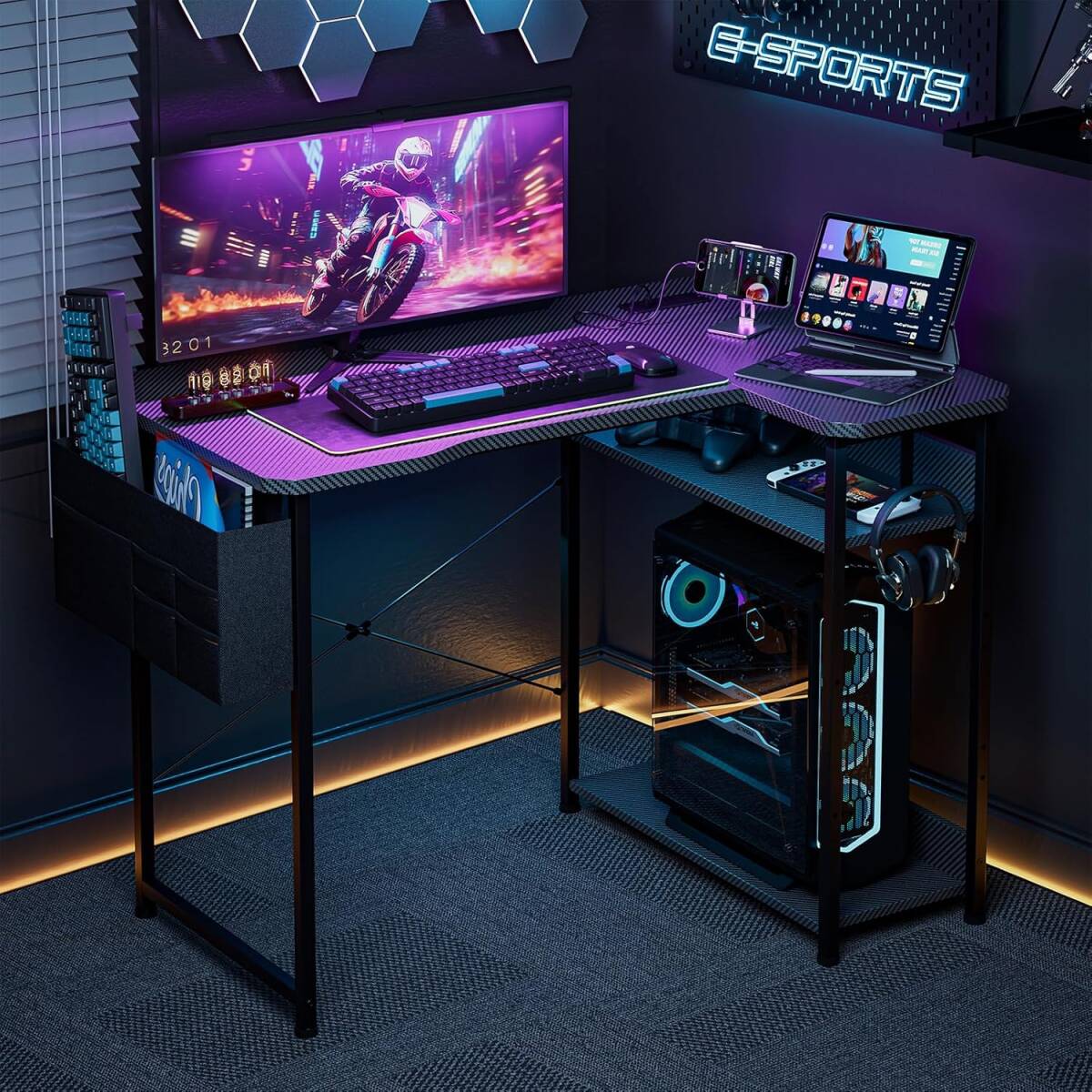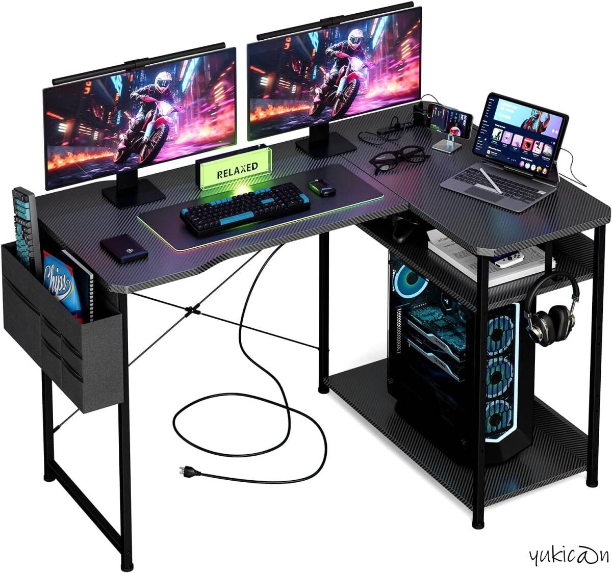 ゲーミングデスク L字デスク 黒カーボン板 左右入替OK 収納バッグ付き コンセント付き 幅120 cm 棚高さ調節可能 棚付き ゲームワークデスク
