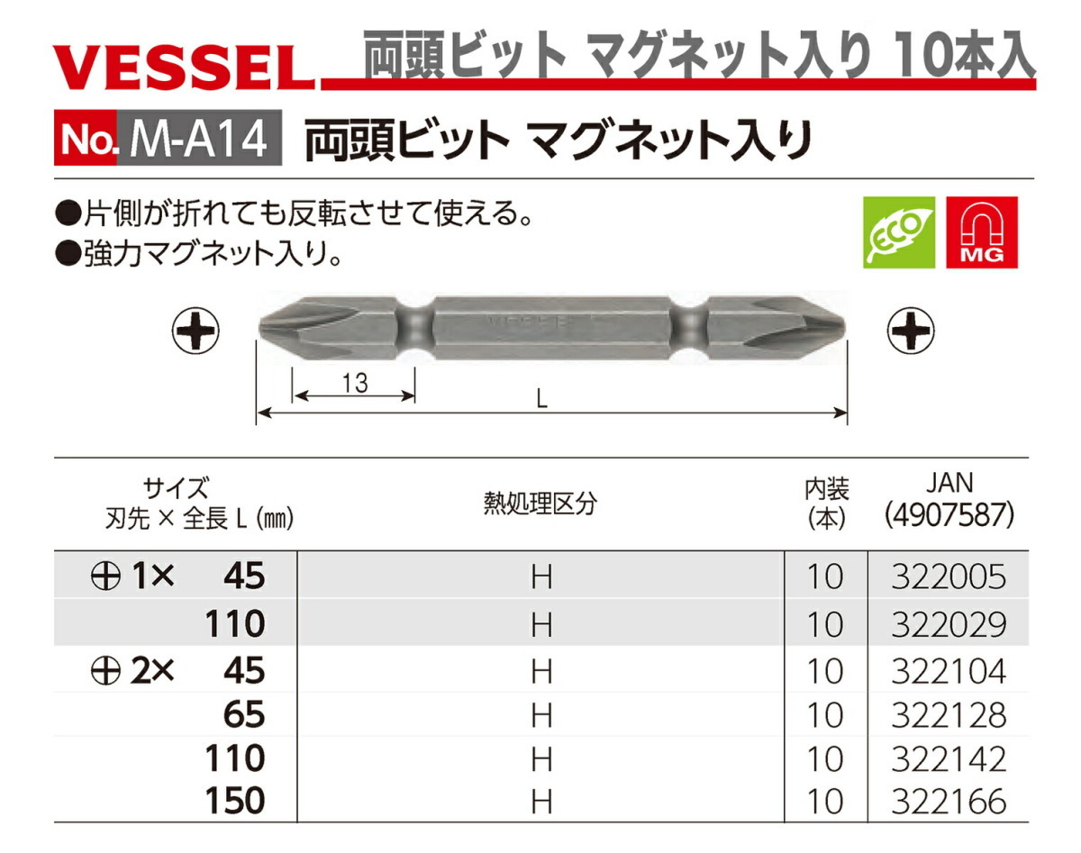 VESSEL 両頭ビット マグネット入り 10本入 M-A14+2x65H