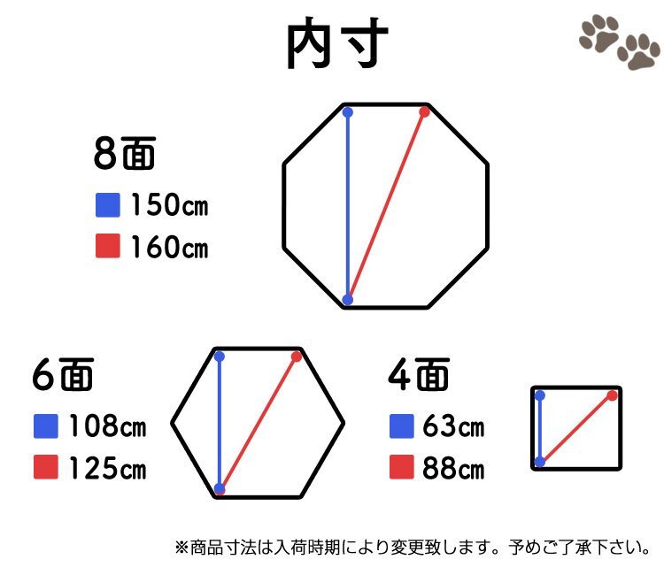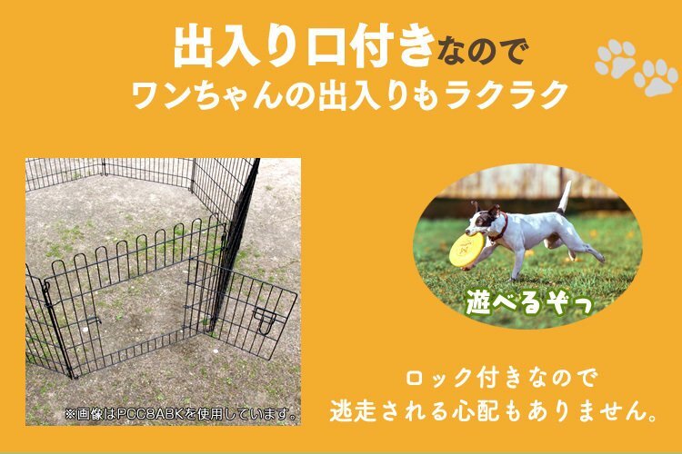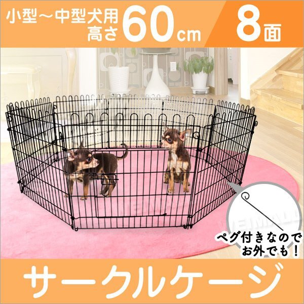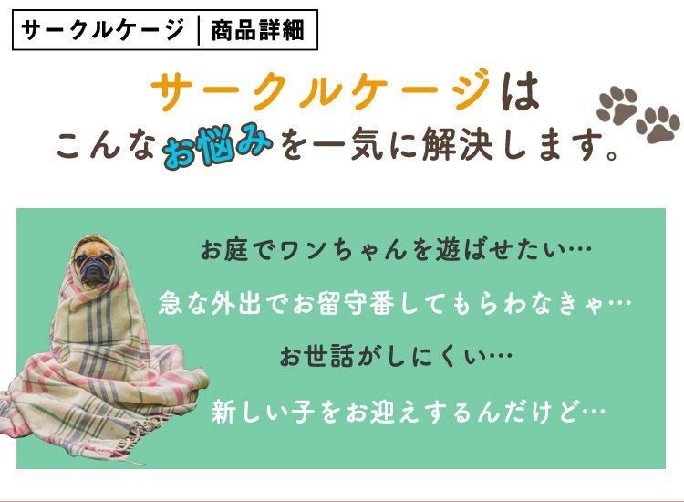 室内でもアウトドアでもご使用いただけます。 設置場所、用途に合わせ簡単に色んな形に出来ます♪ 組立ては超カンタンです! ウサギなどの小さな動物でも使えます♪ 上部はワンちゃんが怪我をしないように丸く加工しています。 ドア付きで簡単に出入りできます。 もちろん、ロックで脱出防止! 屋外使用時に便利なペグが付属しています。 アウトドアやお庭で大活躍! 【商品仕様】 形状:8面 1面サイズ(約):幅63cm×高さ60cm 入口サイズ(約):幅35cm×高さ33cm 本体重量(約):8kg 材質:スチール 扉の向き:右開き 【商品内容】 ドア付き柵 ×1 柵 ×7 ペグ ×8 固定ポール ×8 【注意事項】 ・ペットに合った高さのサークルをお選びください。 ・室内でのご使用時には床に傷がつかないよう保護してお使いください。 ・商品は、モニターによって色合いが異なって見える場合があります。 ・仕様・デザインは改良のため予告なく変更することがあります。 |