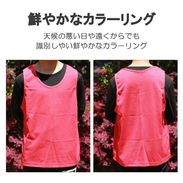 サッカーやバスケなどスポーツシーンはもちろん、イベントやボランティアスタッフなど、幅広くご使用いただけるゼッケンベストの2枚セットです。