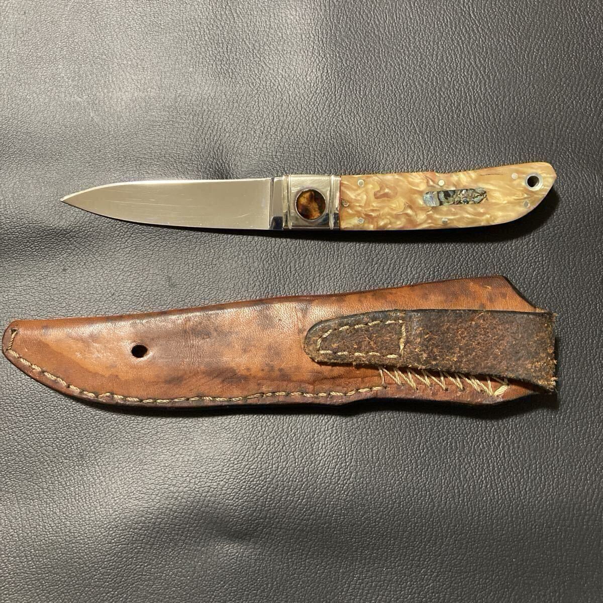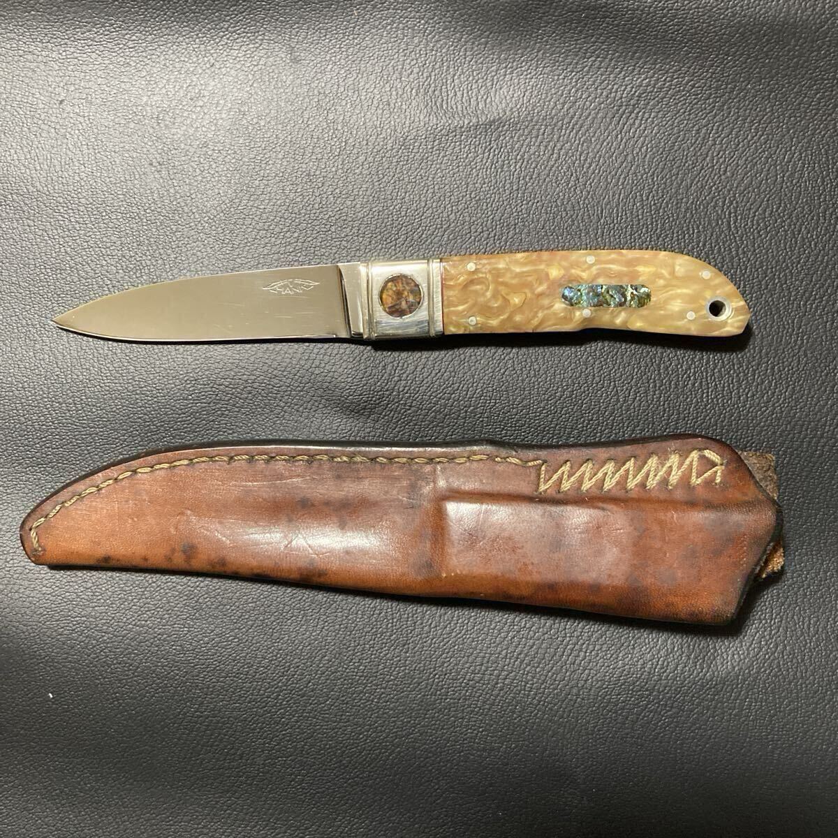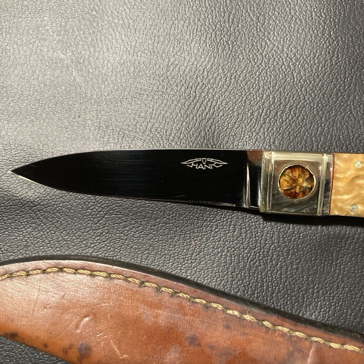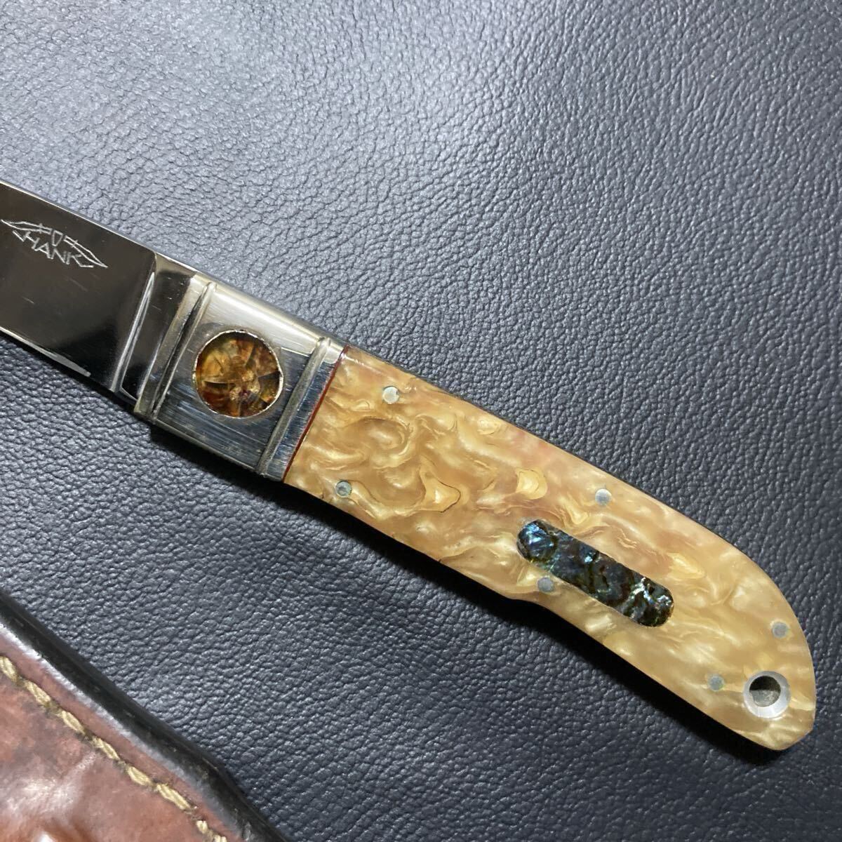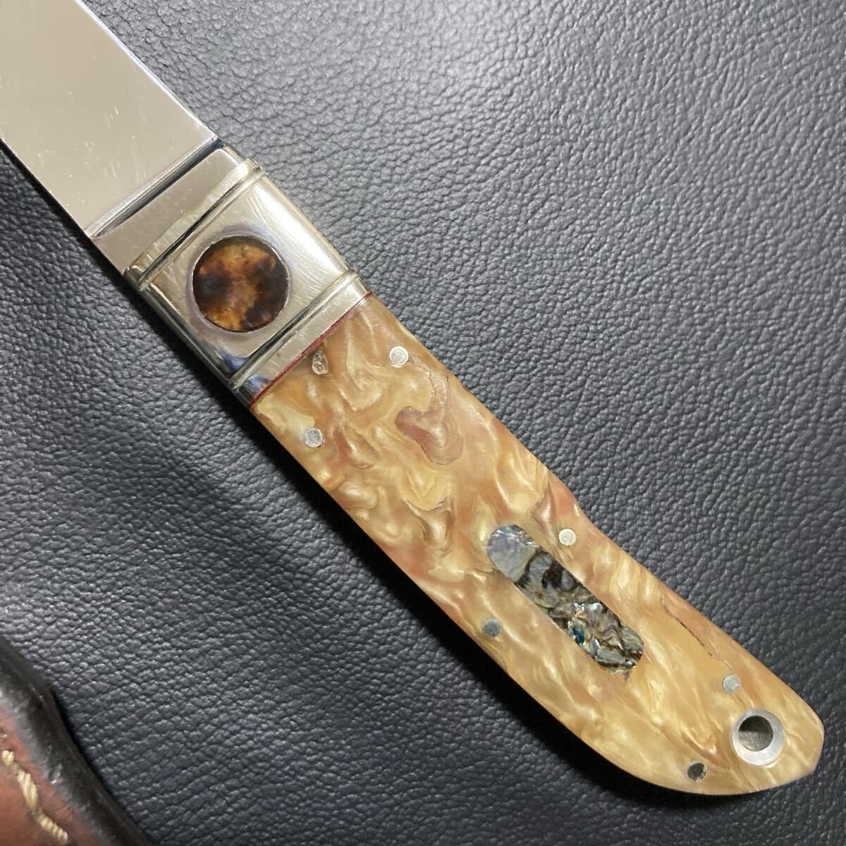 メイプルパールのハンドルにアバロンやべっ甲をあしらったハンク氏らしいオリジナル性あふれたナイフです。
