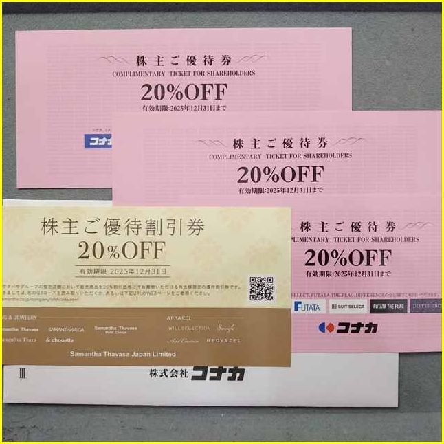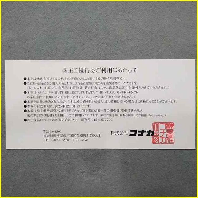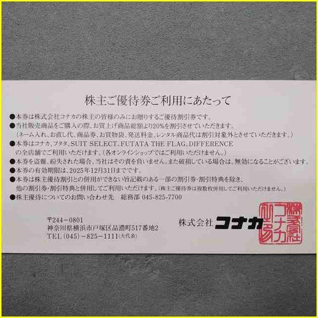 【コナカ 株主優待券・サマンサタバサグループ割引券/期限2025年12月31日迄】 株式会社コナカ 株主ご優待券 20%OFF /スーツセレクト/フタタ