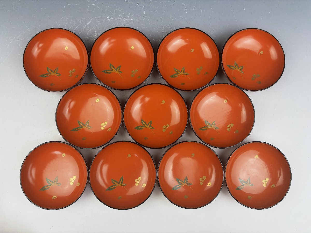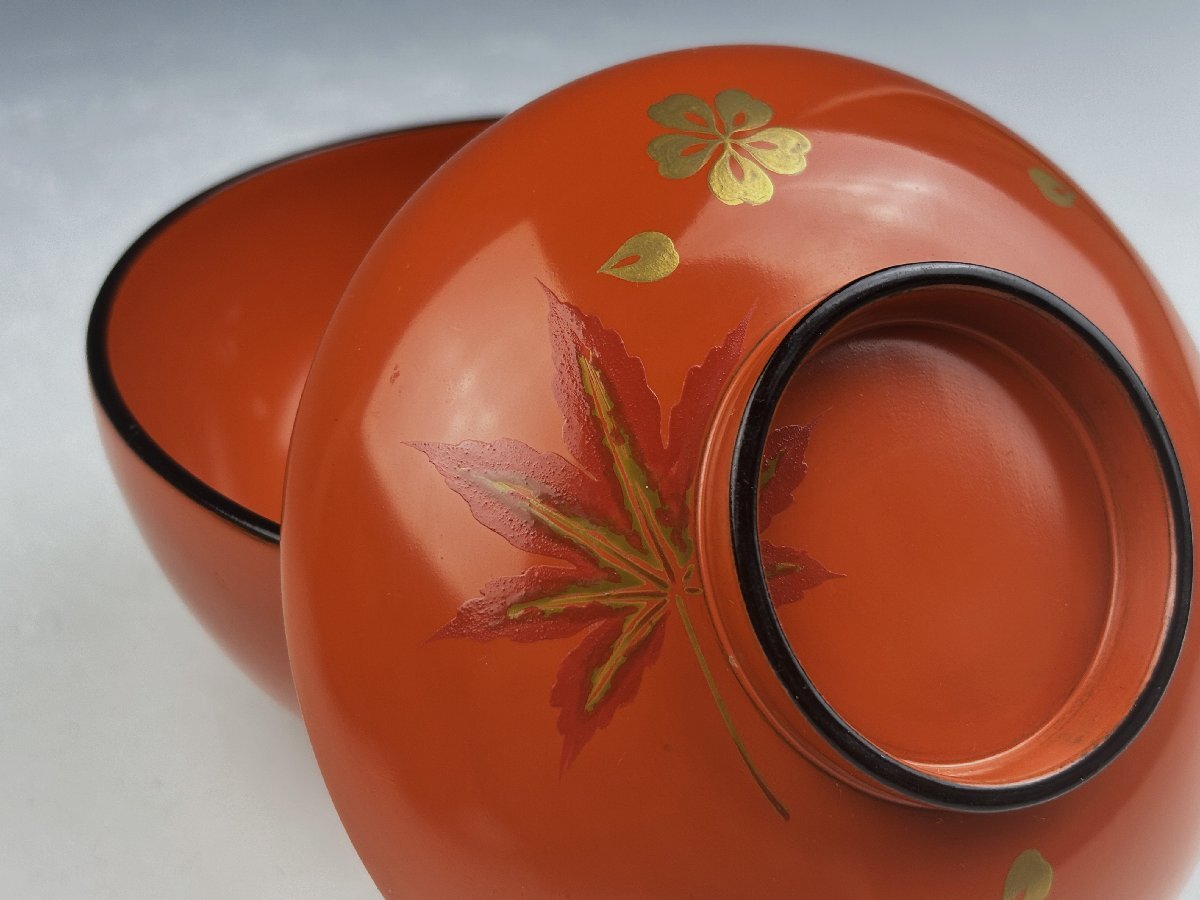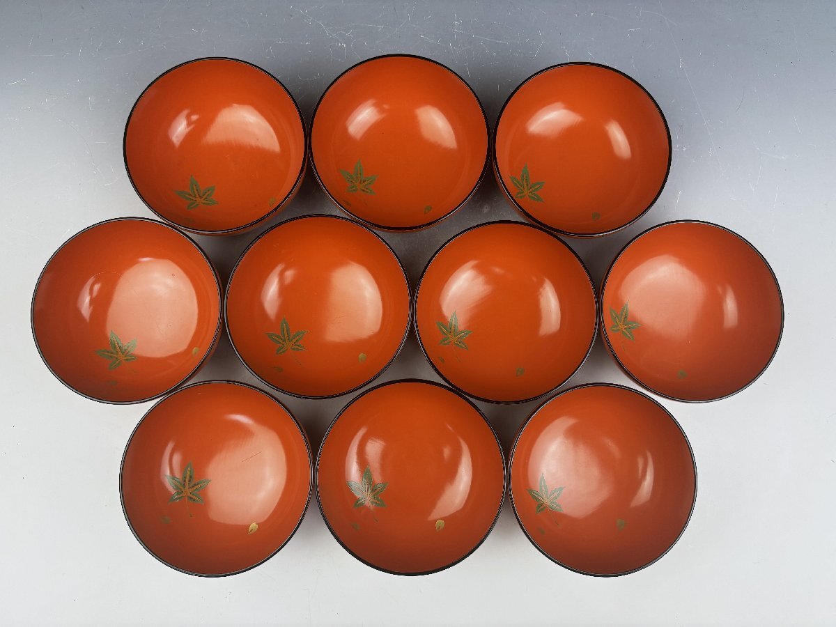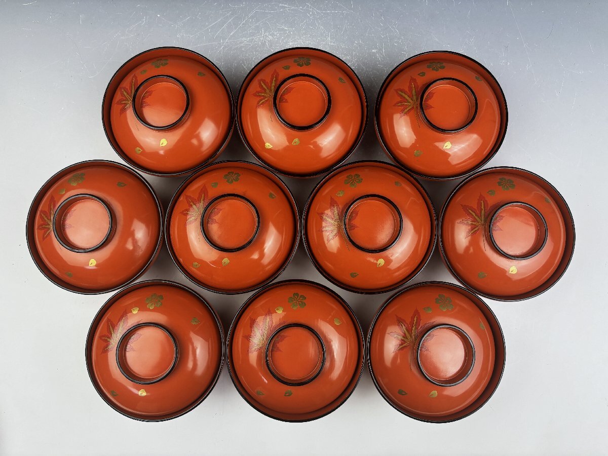 時代物 輪島塗 朱塗 色粉金蒔絵 雲錦蒔絵 紅葉桜図 吸物椀 汁物椀 蓋椀 10客揃 共箱 茶器 茶道具 和食器 木製漆器 古美術骨董品 SGS124
