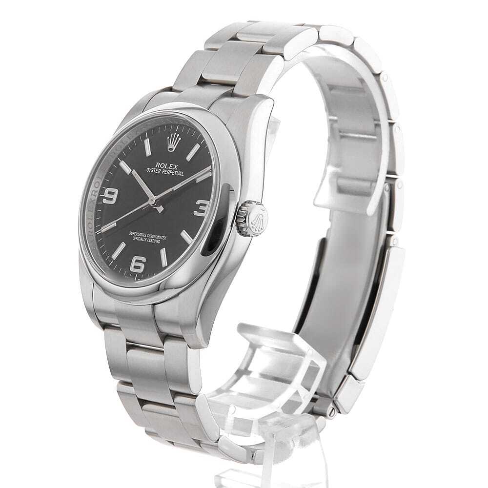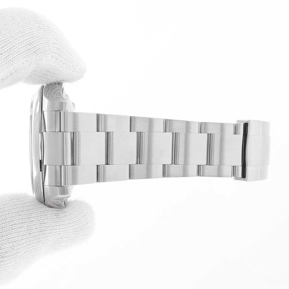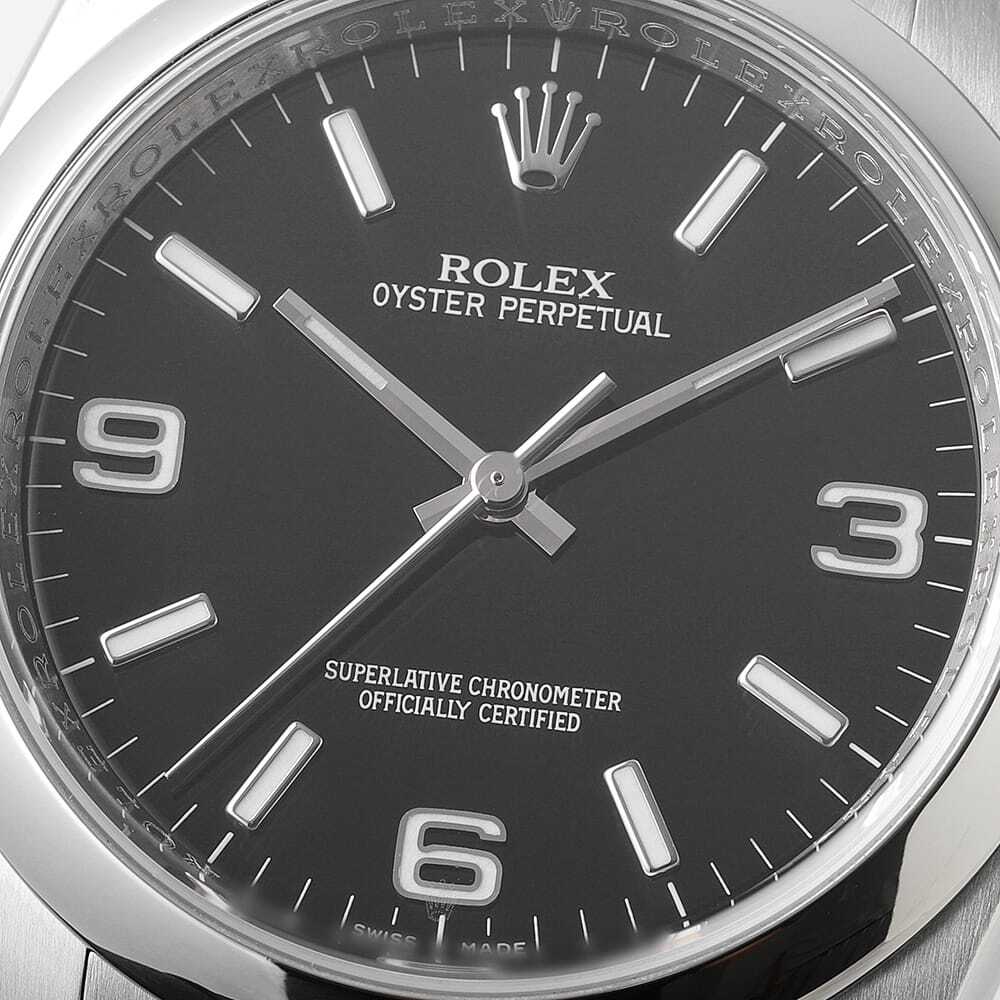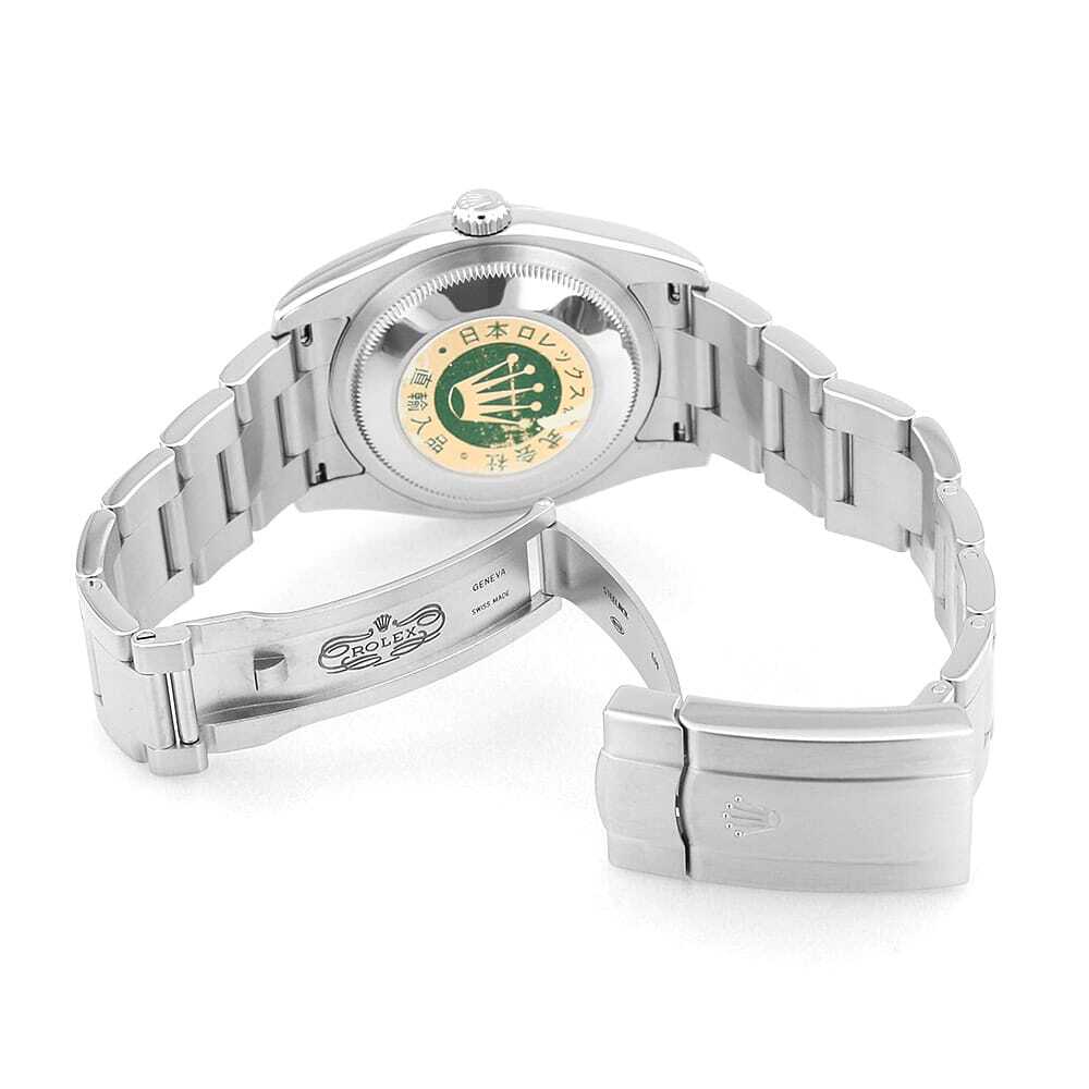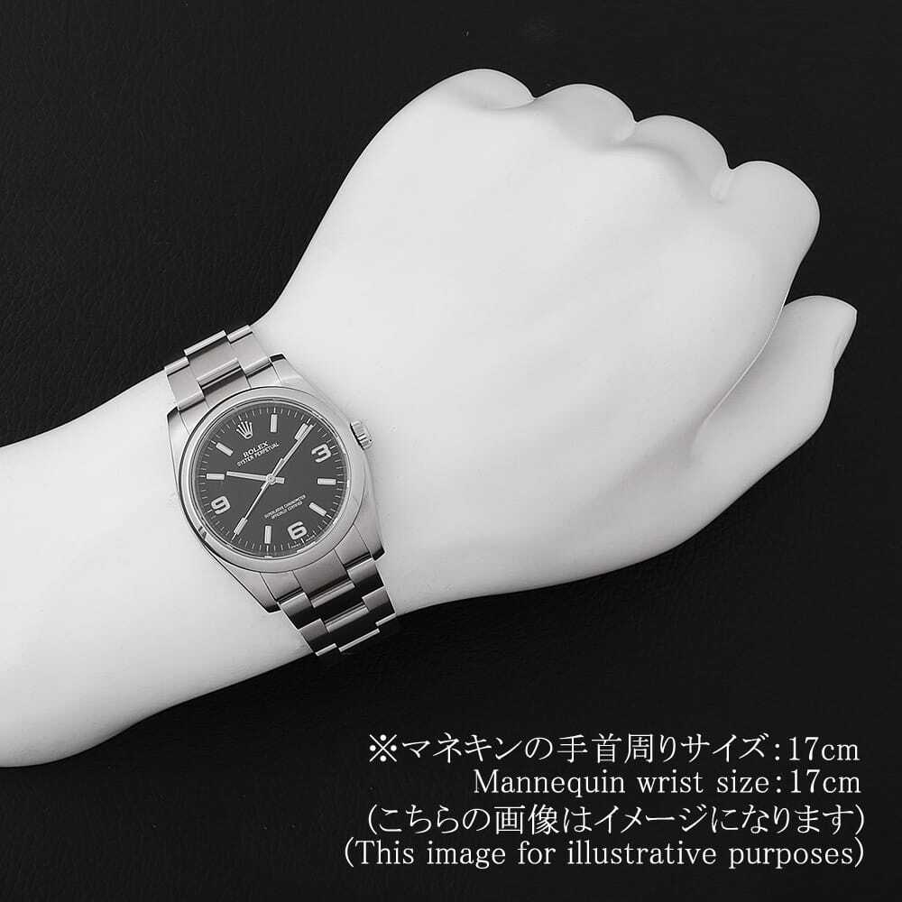 | モデル情報 | 2008年からリリースされているオイスターパーペチュアル、中でもこちらは初期の約一年ほどしか生産されず日本市場でしか販売されなかったとされている通称「日本限定」モデルになります。黒文字盤に369アラビアとバーのインデックスでシンプルなデザインですが、その顔は有名なスポーツモデルであるエクスプローラーIを彷彿とさせるものであり、サイズも36ミリのため当時の現行モデルであったエクスプローラーIの114270とも酷似していました。短命生産で人気モデルに似たデザインというロレックスファンの気持ちをくすぐる垂涎のモデルとなっております。 |