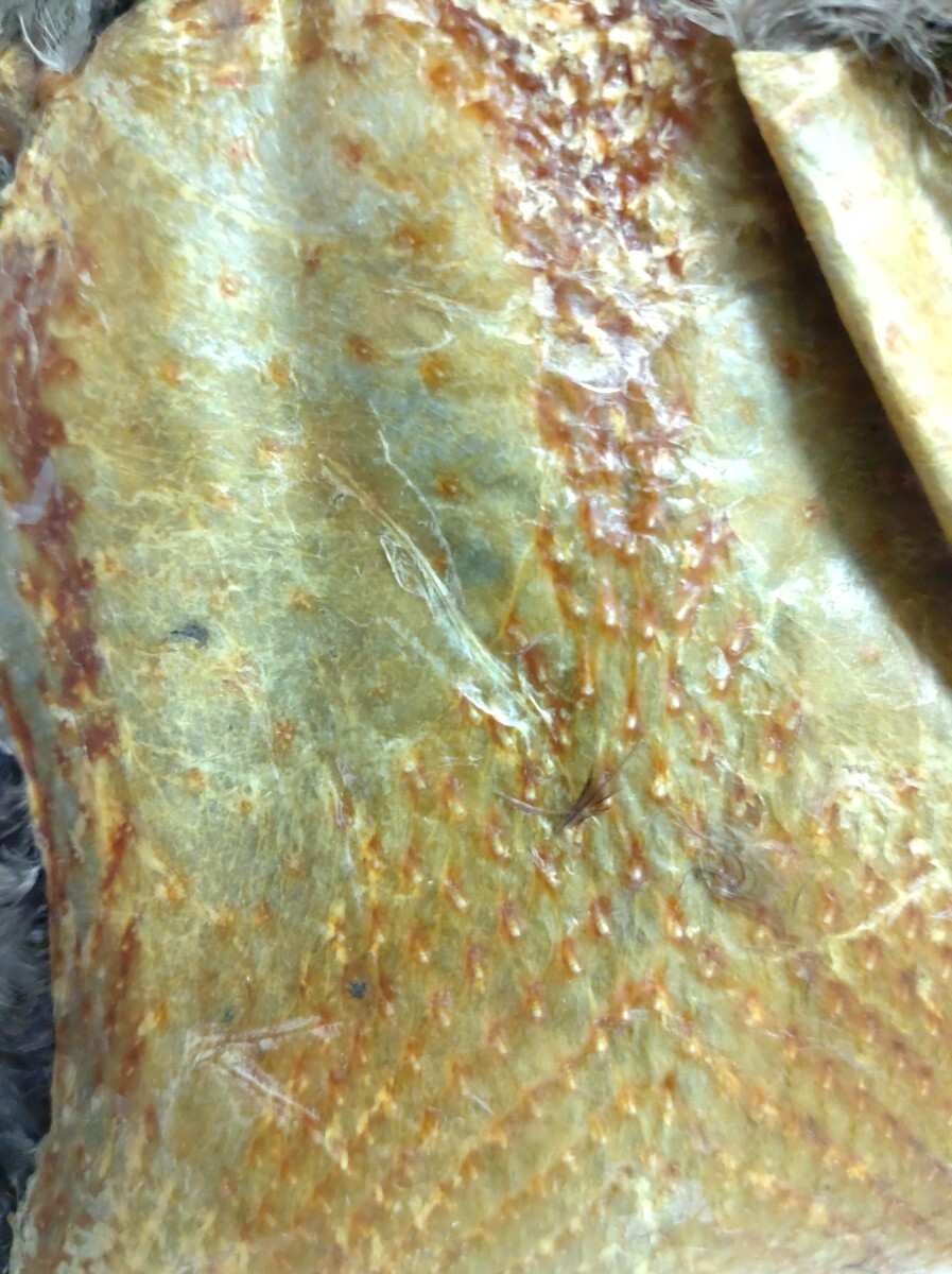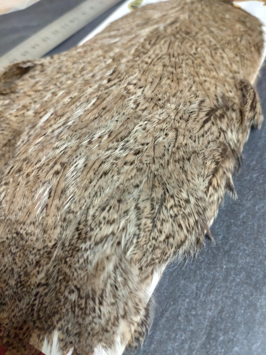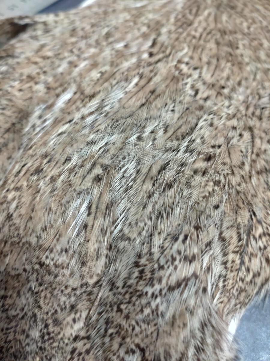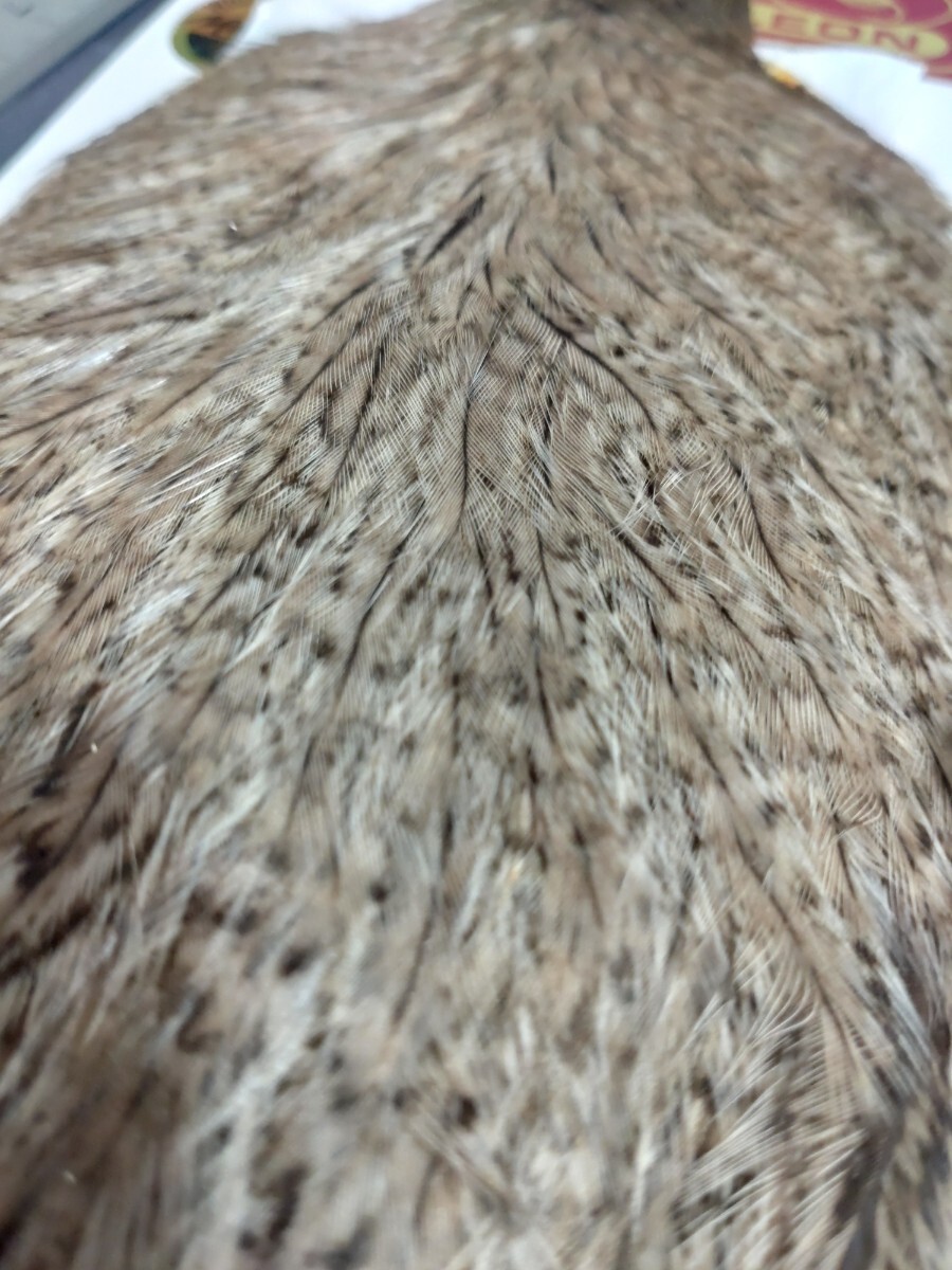 Coq de Len 特有の 深い艶・オイルグロスと、ヘン♀特有の しなやかな繊維が際立つ上物で、特に美しい mottled(モットルド/スペックルド)パターンが特徴です。