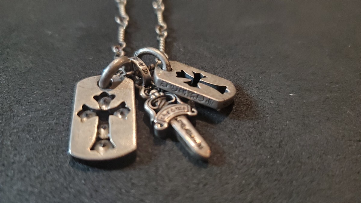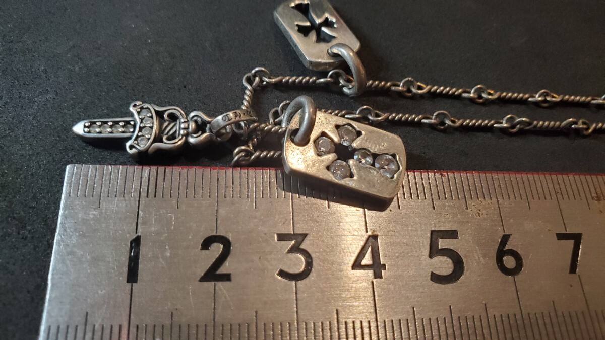 石のセットされたスモールドッグタグとダガー、未セットのドッグタグの3つを1本のチェーンに連ねました。