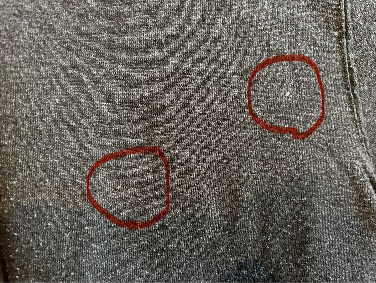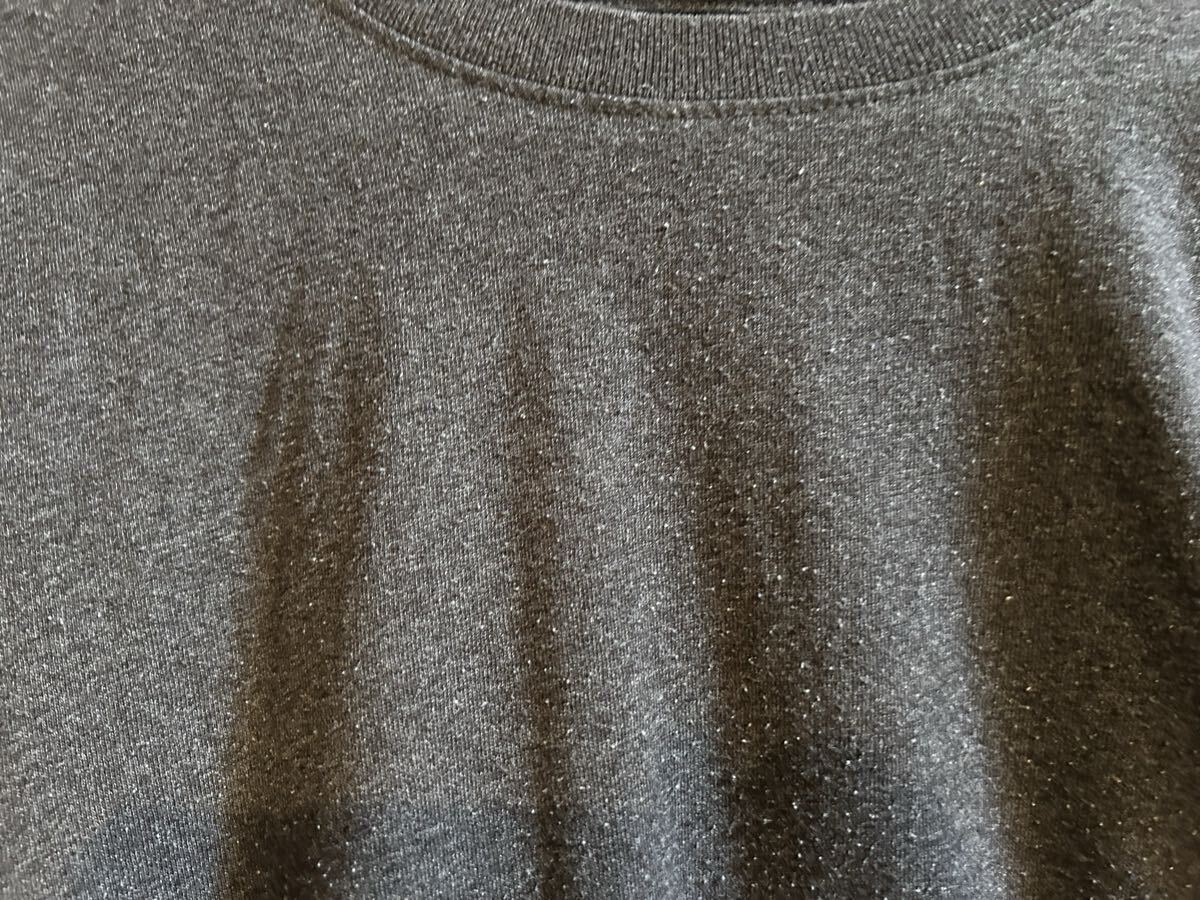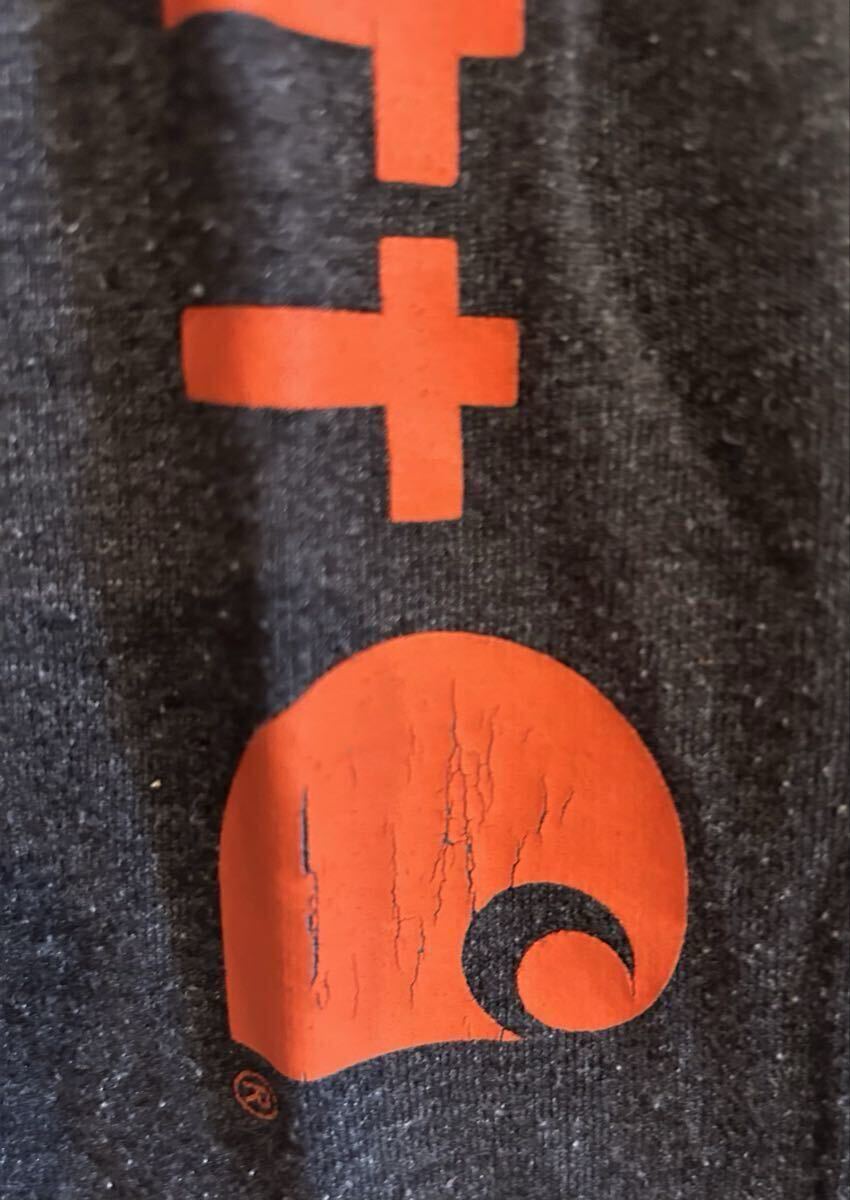 着用に伴う、シワ、スレ、毛羽立ち、毛玉、ロゴの割れ、左胸に色抜け、タグの切れ。