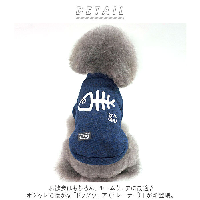 | 商品説明 | ・・お散歩はもちろん、ルームウェアに最適♪オシャレで暖かな「ドッグウェア(トレーナー)」が新登場。 ・表生地は色の異なる糸で織りあげたメランジ調ニット生地、裏地は滑らかな起毛素材で仕上げたワンちゃん用のぽかぽかトレーナー。 ・トレーナーの生地は、薄手で軽く吸湿性にも優れたコットンニット素材を使用。肌寒さを感じる季節はもちろん、秋口から春先まで長く着れる3シーズン仕様。 ・背中からふんわり被せた後に両前脚を優しく袖に通し、前合わせのスナップボタンを閉じるだけでお着換え簡単。 ・お腹まわりやお尻は大きく開いたデザインなので、おトイレでトレーナーの生地を汚す心配がないのも嬉しいポイント! ・小型犬から中型犬まで、ピッタリサイズが選べちゃう!Sサイズから2XLサイズまで、豊富なサイズからチョイス可能。小さなサイズは、ネコちゃん用にも♪ ・サカナの骨をかたどったユニークなモチーフと、「1986 DOGBABY」のフェイクレザータグがデザインのワンポイント。 ・肌寒さが気になる秋冬時期のお散歩用ウェアに。ルームウェアやパジャマとして、朝晩の冷え込み対策にもオススメ。 |