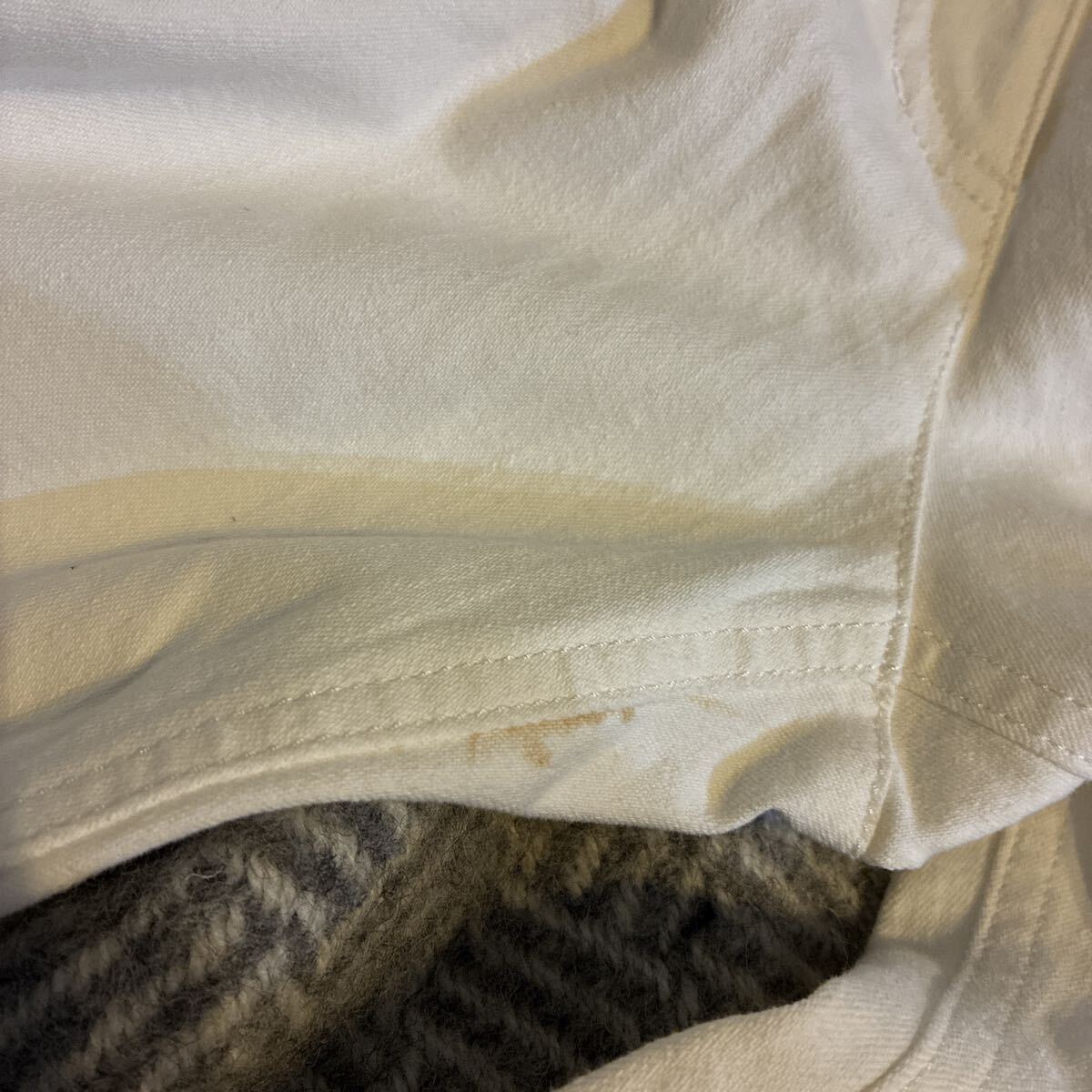 未使用ですが股下の縫い目のところに薄い茶色のシミが2cmくらいあります。写真7枚目